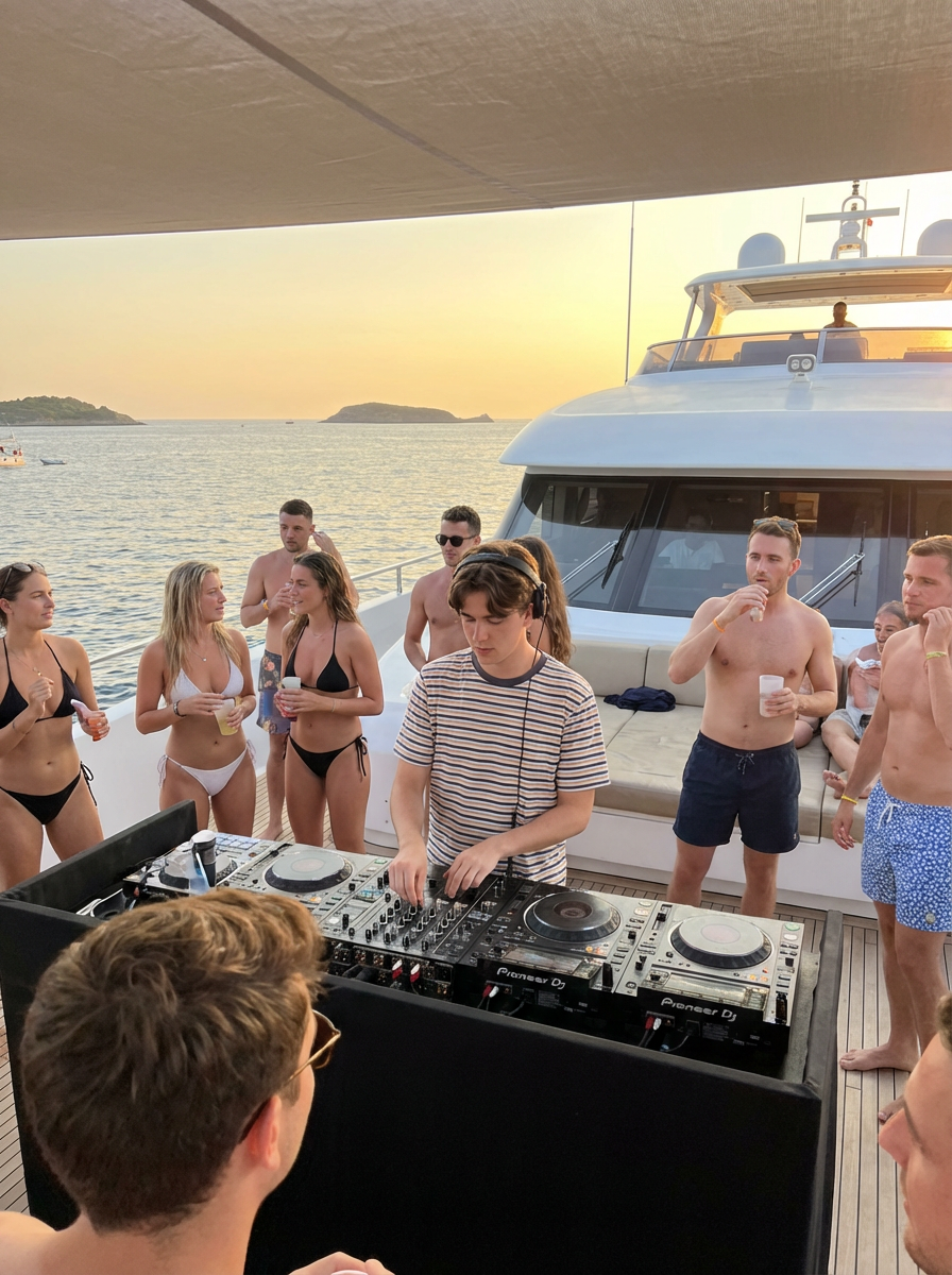 POV from audience: model as DJ at Cercle event on luxury yacht, ocean setting, DJ booth on deck, intimate crowd on boat, sunset over water, Mediterranean or tropical waters, yacht party atmosphere, elegant maritime setting, golden hour lighting reflecting off water, only show one DJ, audience women in bikini, swimsuits and men in swim shorts