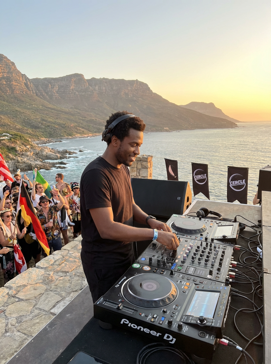POV from audience: model as DJ at Cercle event, scenic outdoor location, professional DJ equipment, beautiful natural backdrop, intimate crowd, golden hour lighting, artistic festival setup, mountains or coastline in background, only show one DJ