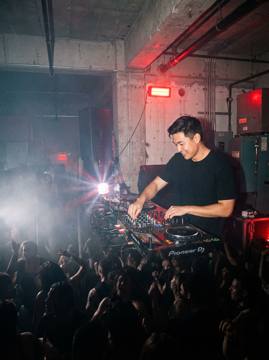 POV from audience: model as DJ at techno warehouse party, industrial setting, minimal lighting, fog machines, underground vibe, crowd in shadows, raw concrete walls, red emergency lighting, authentic underground scene, only show one DJ