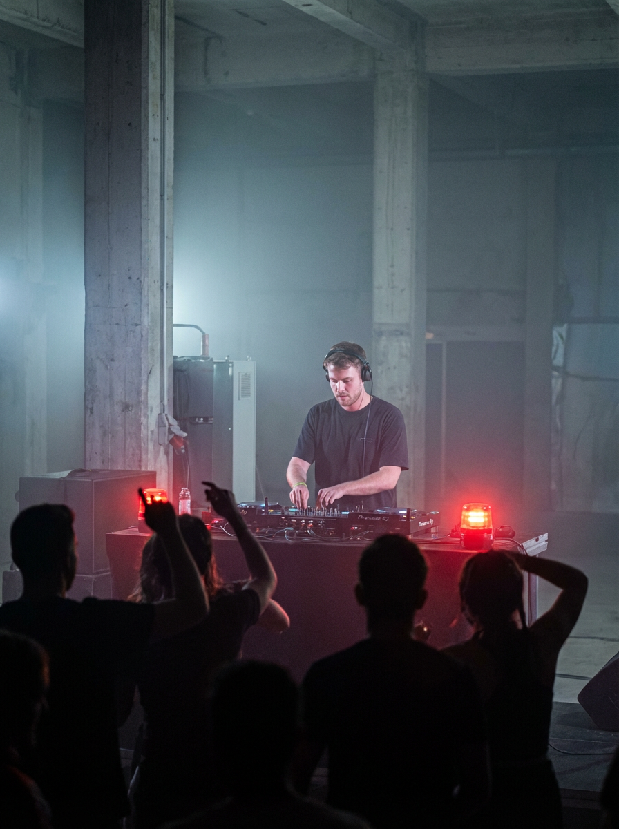 POV from audience: model as DJ at techno warehouse party, industrial setting, minimal lighting, fog machines, underground vibe, crowd in shadows, raw concrete walls, red emergency lighting, authentic underground scene, only show one DJ