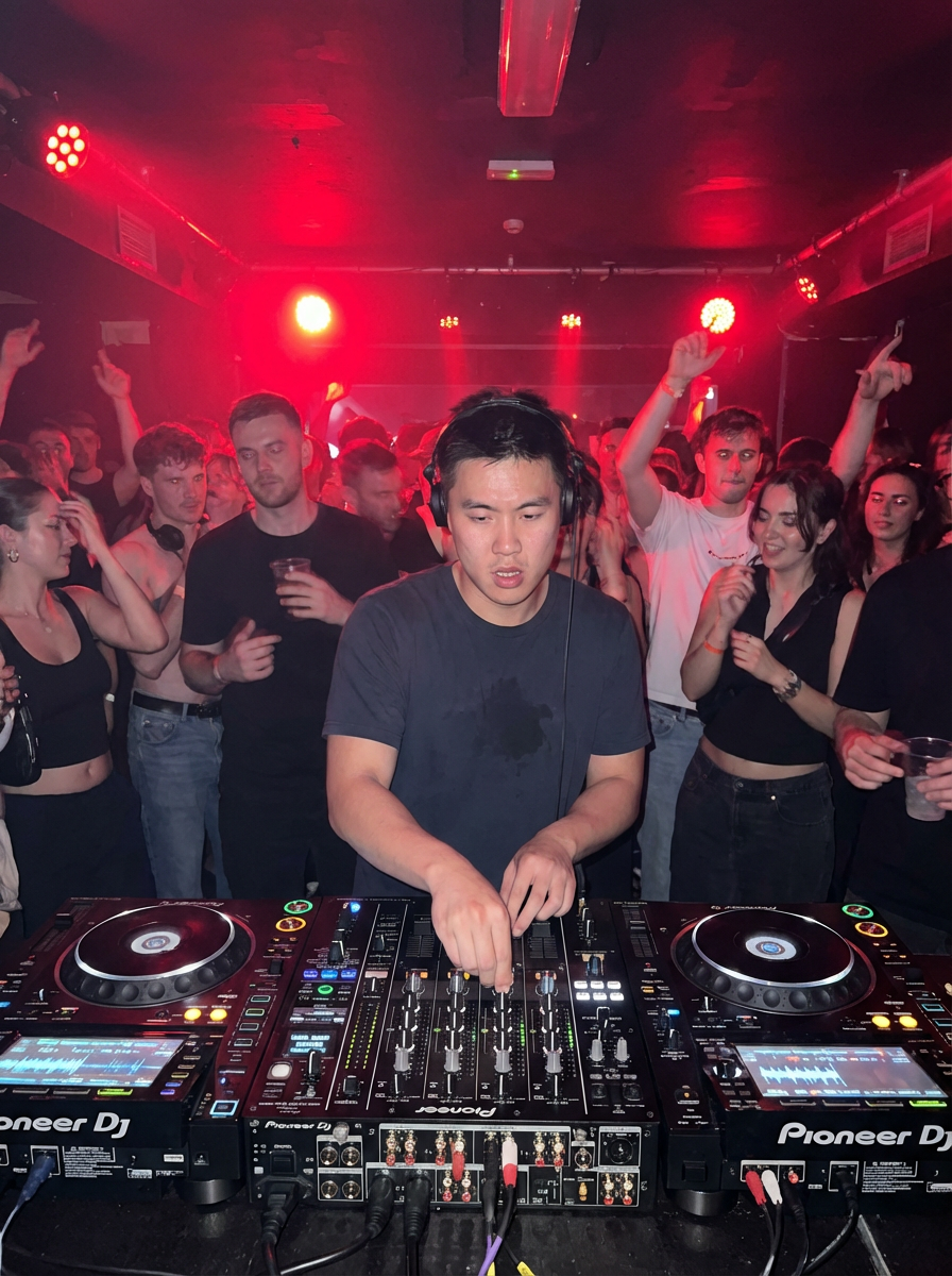 POV from audience: model as DJ performing at underground club, behind Pioneer CDJ-3000s and DJM-900 mixer, intense concentration, strobing lights, packed dancefloor, Boiler Room style setup, intimate venue, red lighting, crowd dancing, only show one DJ