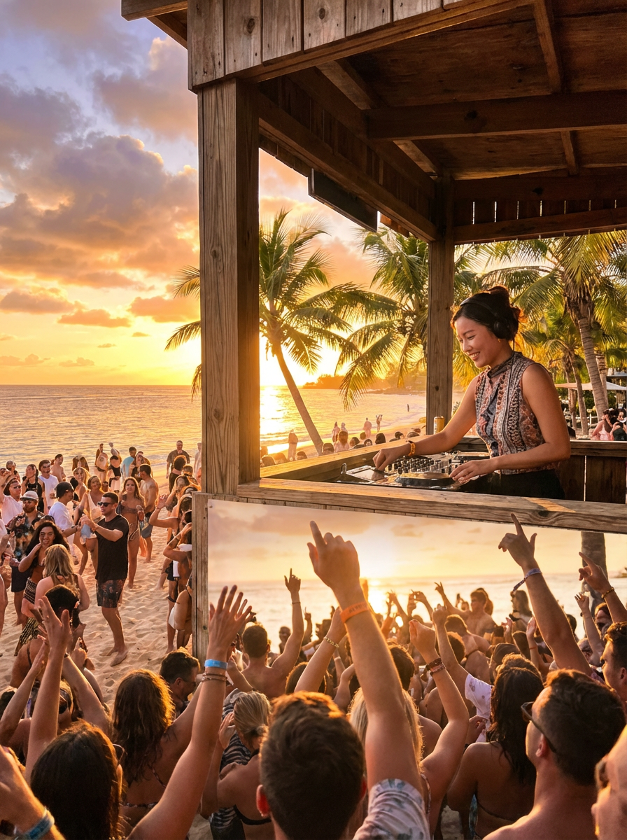 POV from audience: model as DJ at beach festival, sunset performance, tropical setting, crowd on sand, palm trees, ocean backdrop, Cercle-style natural venue, golden hour magic, intimate outdoor gathering, only show one DJ