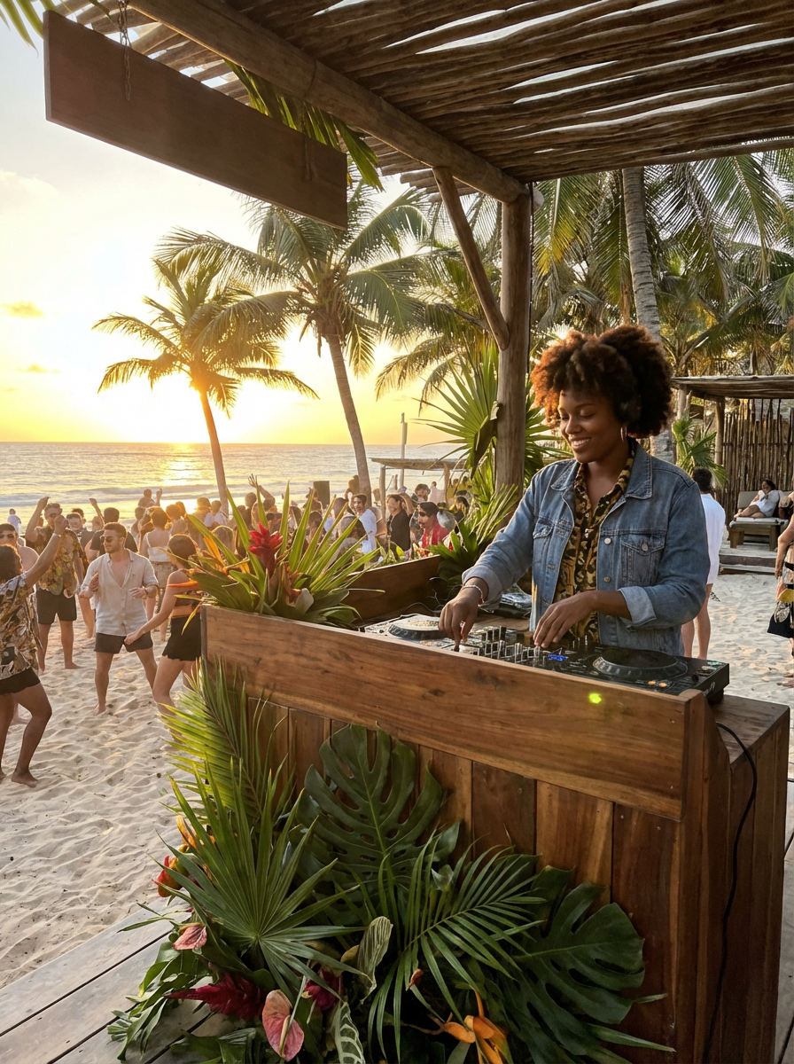 POV from audience: model as DJ at beach festival, sunset performance, tropical setting, crowd on sand, palm trees, ocean backdrop, Cercle-style natural venue, golden hour magic, intimate outdoor gathering, only show one DJ