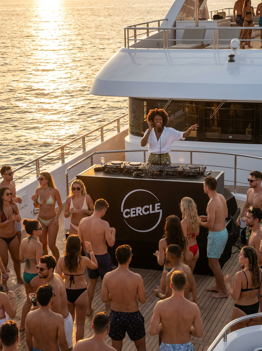 POV from audience: model as DJ at Cercle event on luxury yacht, ocean setting, DJ booth on deck, intimate crowd on boat, sunset over water, Mediterranean or tropical waters, yacht party atmosphere, elegant maritime setting, golden hour lighting reflecting off water, only show one DJ, audience women in bikini, swimsuits and men in swim shorts