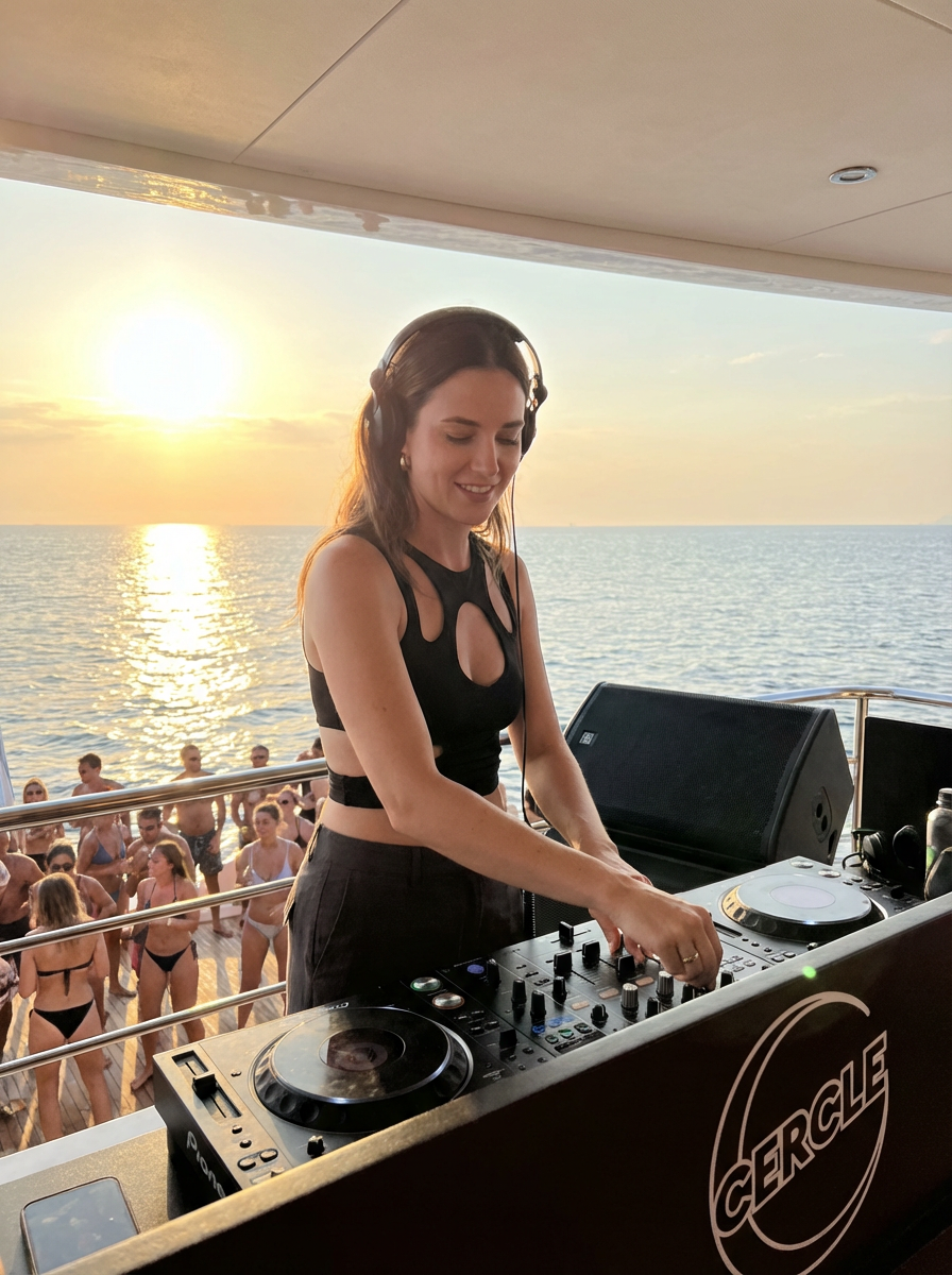 POV from audience: model as DJ at Cercle event on luxury yacht, ocean setting, DJ booth on deck, intimate crowd on boat, sunset over water, Mediterranean or tropical waters, yacht party atmosphere, elegant maritime setting, golden hour lighting reflecting off water, only show one DJ, audience women in bikini, swimsuits and men in swim shorts