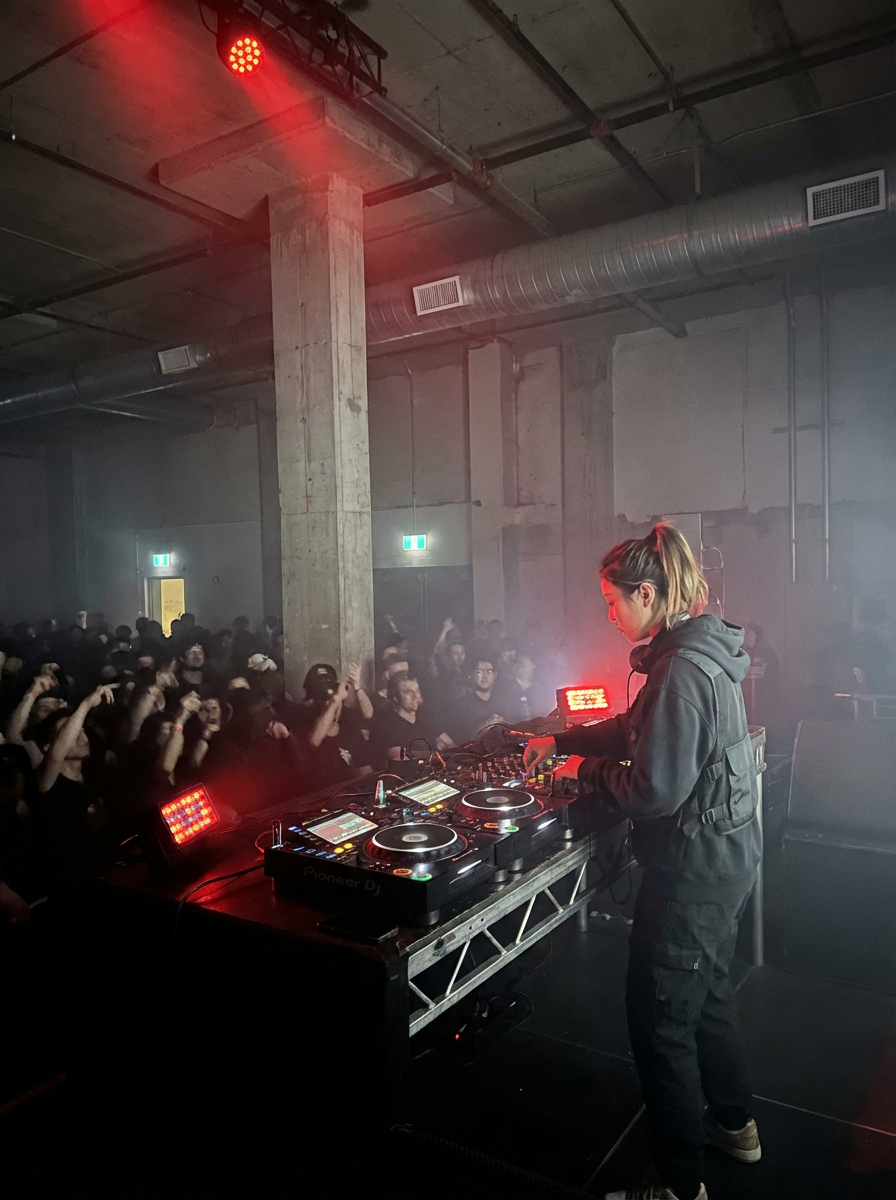 POV from audience: model as DJ at techno warehouse party, industrial setting, minimal lighting, fog machines, underground vibe, crowd in shadows, raw concrete walls, red emergency lighting, authentic underground scene, only show one DJ