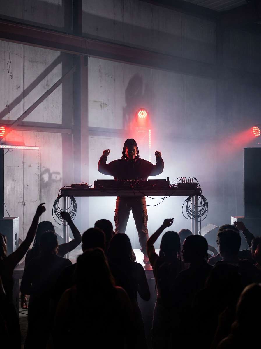 POV from audience: model as DJ at techno warehouse party, industrial setting, minimal lighting, fog machines, underground vibe, crowd in shadows, raw concrete walls, red emergency lighting, authentic underground scene, only show one DJ