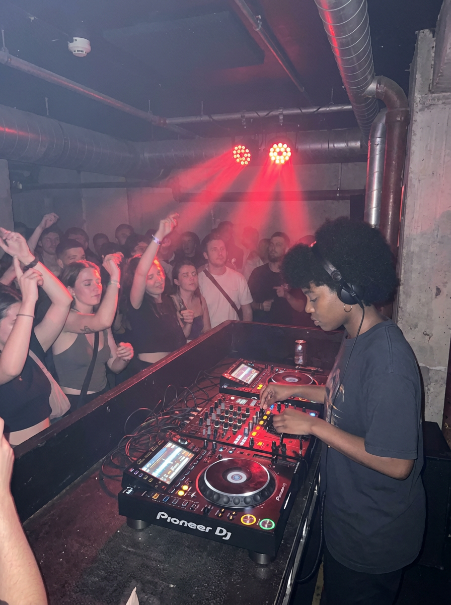POV from audience: model as DJ performing at underground club, behind Pioneer CDJ-3000s and DJM-900 mixer, intense concentration, strobing lights, packed dancefloor, Boiler Room style setup, intimate venue, red lighting, crowd dancing, only show one DJ