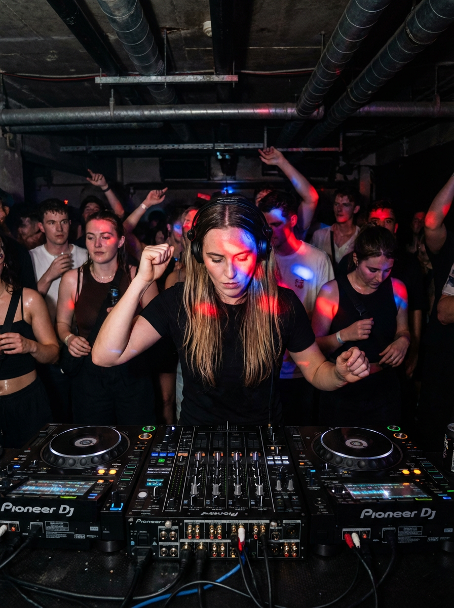 POV from audience: model as DJ performing at underground club, behind Pioneer CDJ-3000s and DJM-900 mixer, intense concentration, strobing lights, packed dancefloor, Boiler Room style setup, intimate venue, red lighting, crowd dancing, only show one DJ