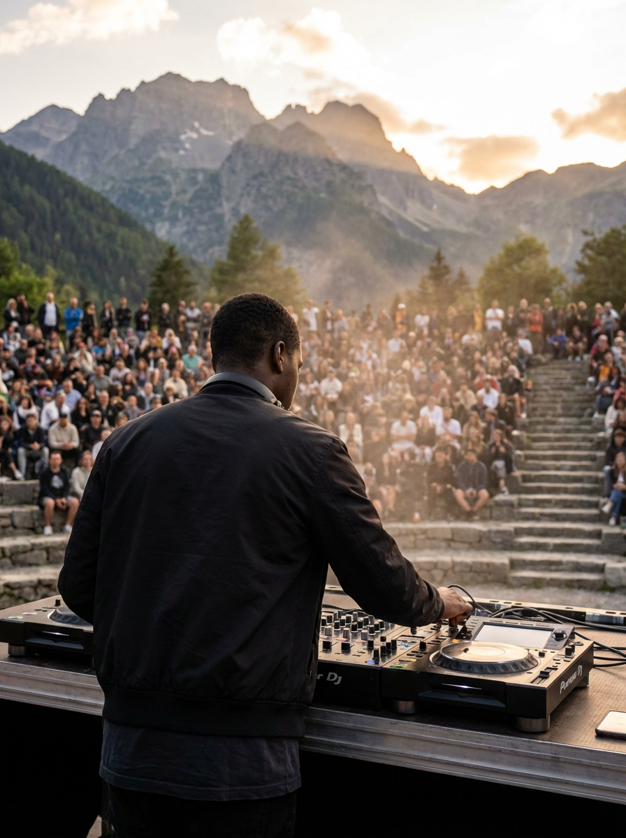 POV from behind DJ: model as DJ facing amphitheater crowd, natural venue setting, tiered audience, outdoor festival, dramatic landscape backdrop, Cercle-style artistic location, breathtaking scenery, only show one DJ