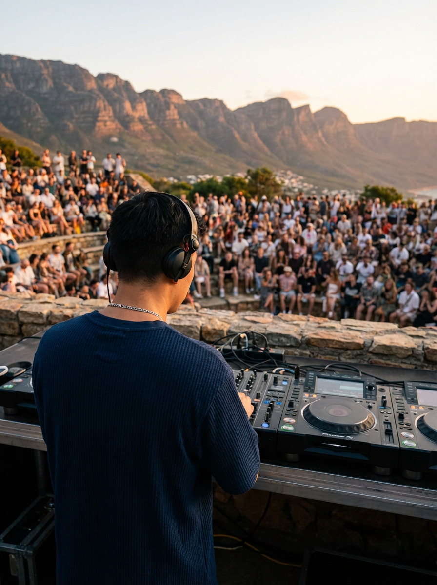 POV from behind DJ: model as DJ facing amphitheater crowd, natural venue setting, tiered audience, outdoor festival, dramatic landscape backdrop, Cercle-style artistic location, breathtaking scenery, only show one DJ