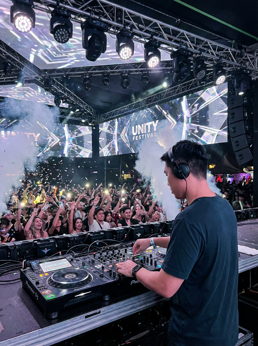 POV from behind DJ: model as DJ with hands on mixer, crowd visible ahead, festival stage setup, LED screens showing visuals, professional lighting rig, energetic crowd response, main stage atmosphere, only show one DJ