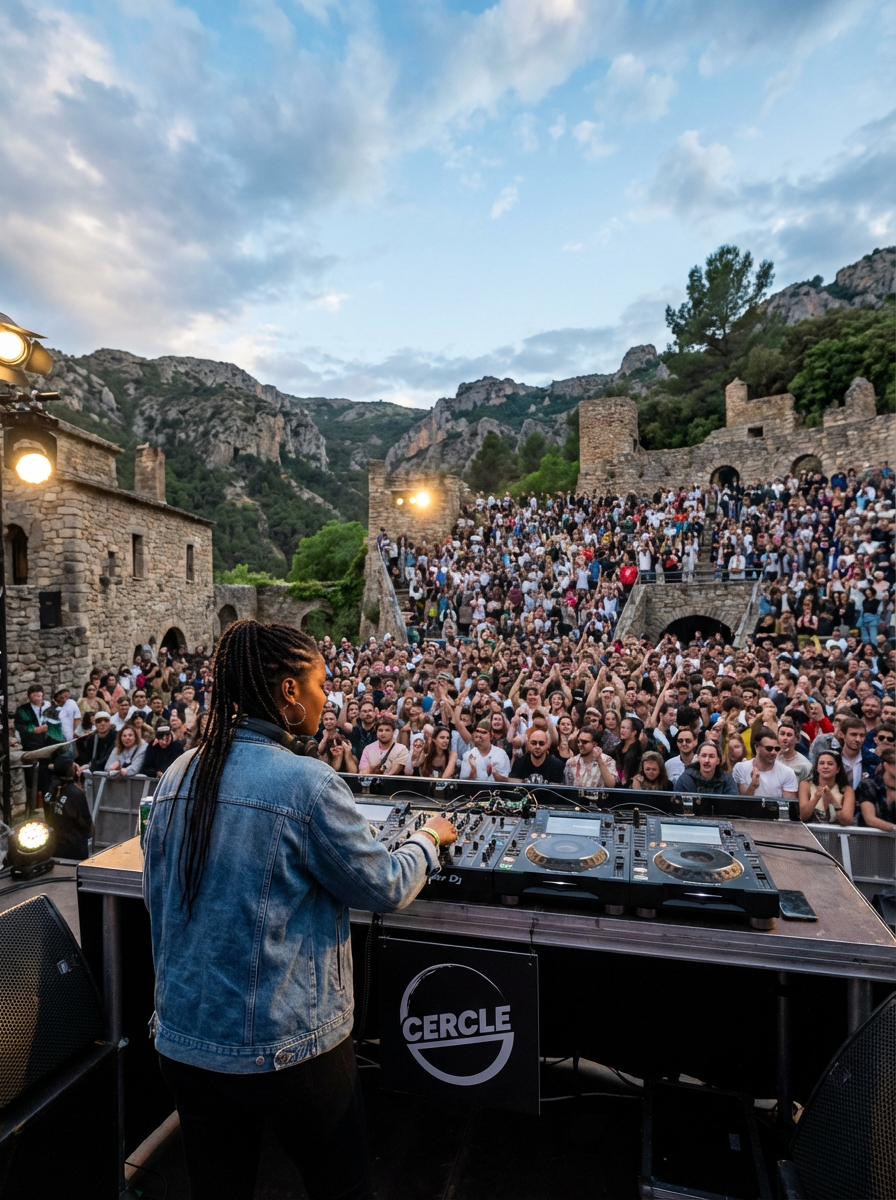 POV from behind DJ: model as DJ facing amphitheater crowd, natural venue setting, tiered audience, outdoor festival, dramatic landscape backdrop, Cercle-style artistic location, breathtaking scenery, only show one DJ