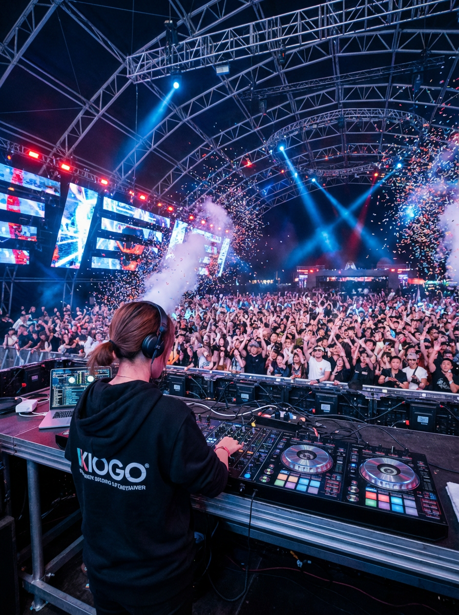 POV from behind DJ: model as DJ facing massive crowd, back view showing DJ booth setup, sea of people with hands up, festival main stage, dramatic lighting from above, LED walls, confetti cannons, epic crowd energy, only show one DJ