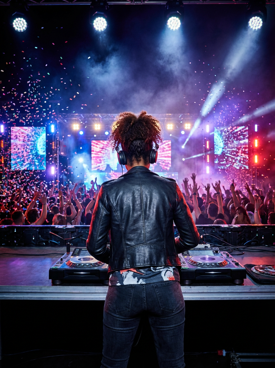 POV from behind DJ: model as DJ facing massive crowd, back view showing DJ booth setup, sea of people with hands up, festival main stage, dramatic lighting from above, LED walls, confetti cannons, epic crowd energy, only show one DJ