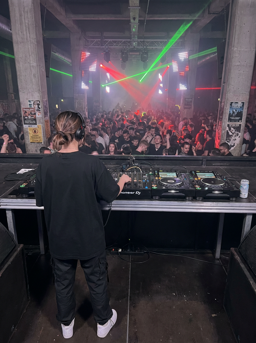 POV from behind DJ: model as DJ overlooking packed club dancefloor, back view at elevated DJ booth, crowd dancing below, laser lights cutting through smoke, underground venue atmosphere, pulsing bass lighting, only show one DJ
