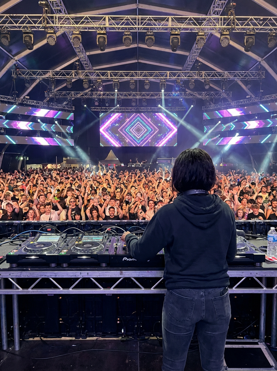 POV from behind DJ: model as DJ with hands on mixer, crowd visible ahead, festival stage setup, LED screens showing visuals, professional lighting rig, energetic crowd response, main stage atmosphere, only show one DJ