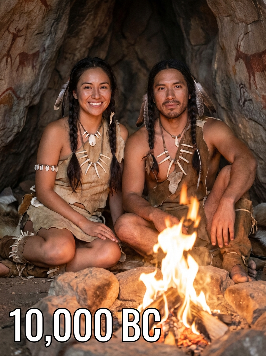 Prehistoric couple from 10,000 BC in primitive clothing - animal hide dress, bone jewelry, braided hair with feathers , sitting together around a campfire in a cave setting with rock paintings, text overlay in bottom corner reading "10,000 BC" in white sans serif font with black outline