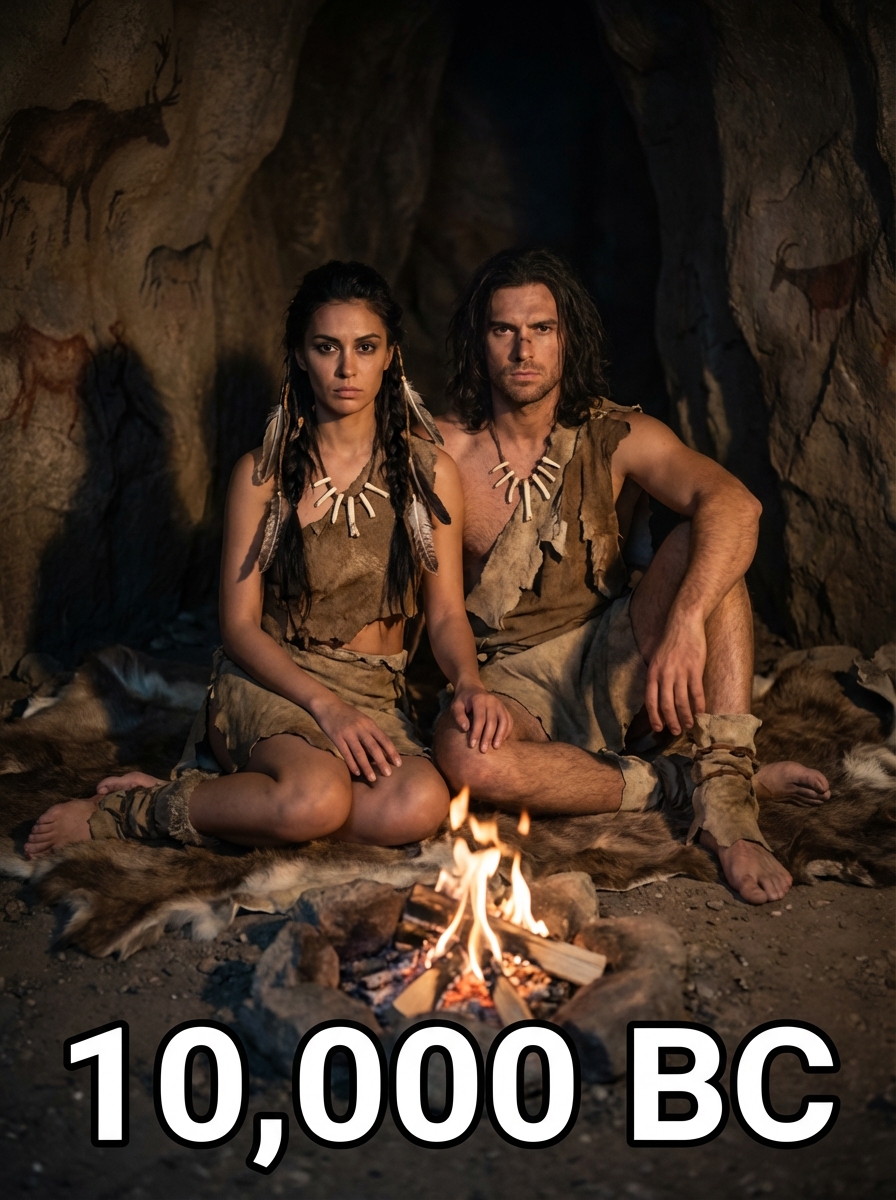 Prehistoric couple from 10,000 BC in primitive clothing - animal hide dress, bone jewelry, braided hair with feathers , sitting together around a campfire in a cave setting with rock paintings, text overlay in bottom corner reading "10,000 BC" in white sans serif font with black outline
