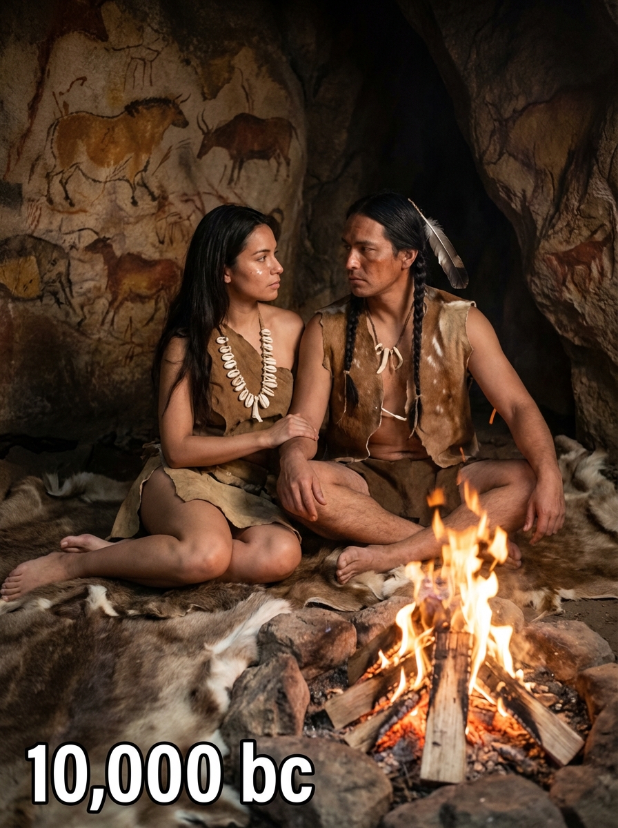 Prehistoric couple from 10,000 BC in primitive clothing - animal hide dress, bone jewelry, braided hair with feathers , sitting together around a campfire in a cave setting with rock paintings, text overlay in bottom corner reading "10,000 BC" in white sans serif font with black outline