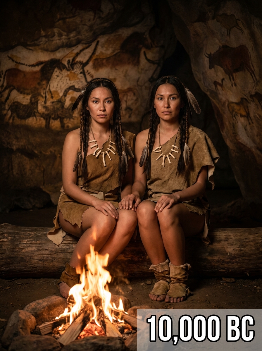 Prehistoric couple from 10,000 BC in primitive clothing - animal hide dress, bone jewelry, braided hair with feathers , sitting together around a campfire in a cave setting with rock paintings, text overlay in bottom corner reading "10,000 BC" in white sans serif font with black outline