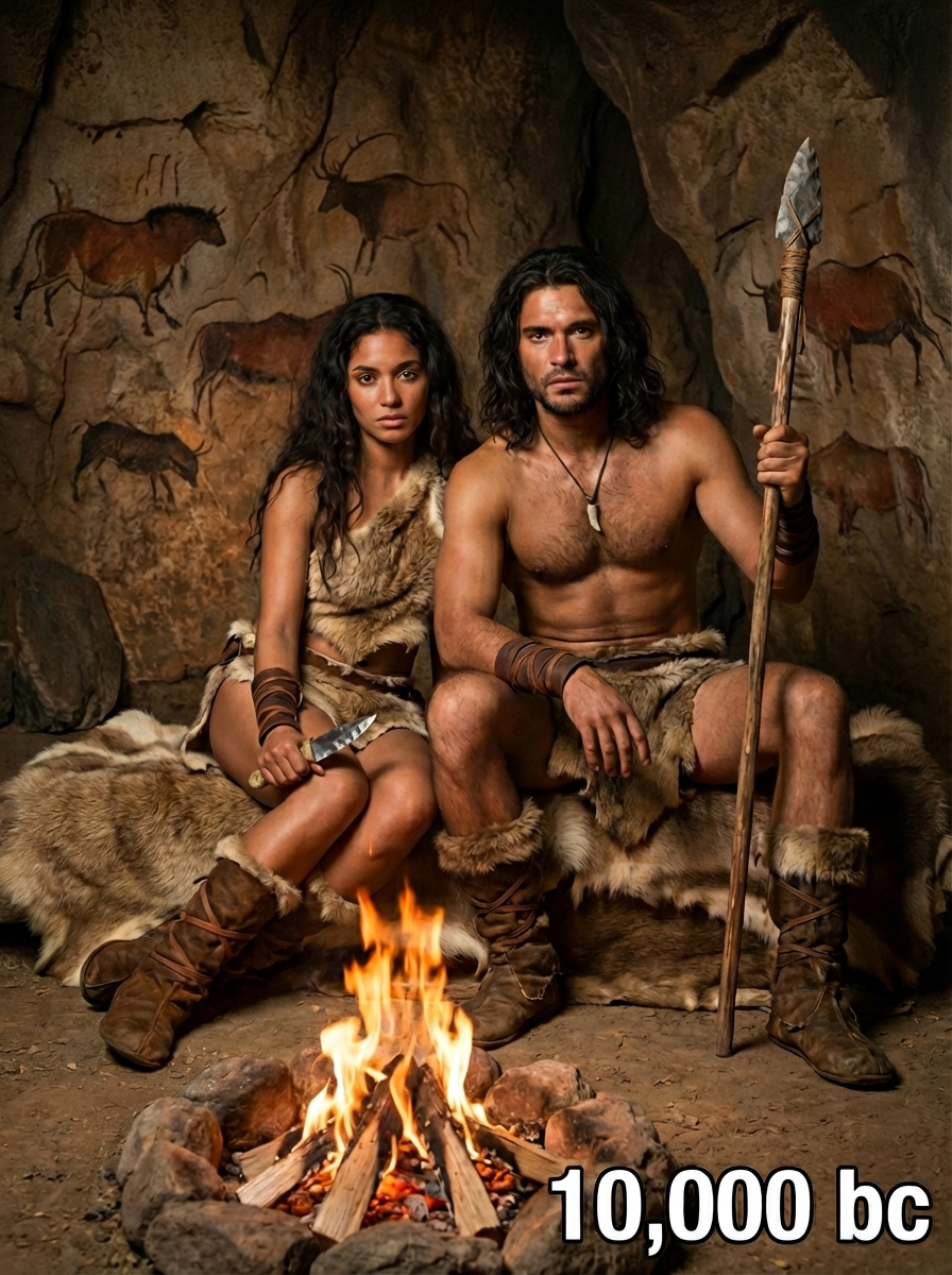 Prehistoric couple from 10,000 BC in primitive clothing - fur loincloth, leather wrappings, primitive weapons, sitting together around a campfire in a cave setting with rock paintings, text overlay in bottom corner reading "10,000 BC" in white sans serif font with black outline