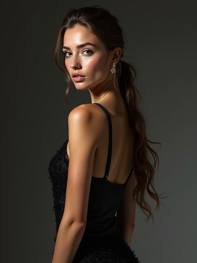 Professional fashion insanely beautiful model in a high-end studio. Wearing designer couture, perfect runway posture . Editorial lighting, fashion magazine quality.
