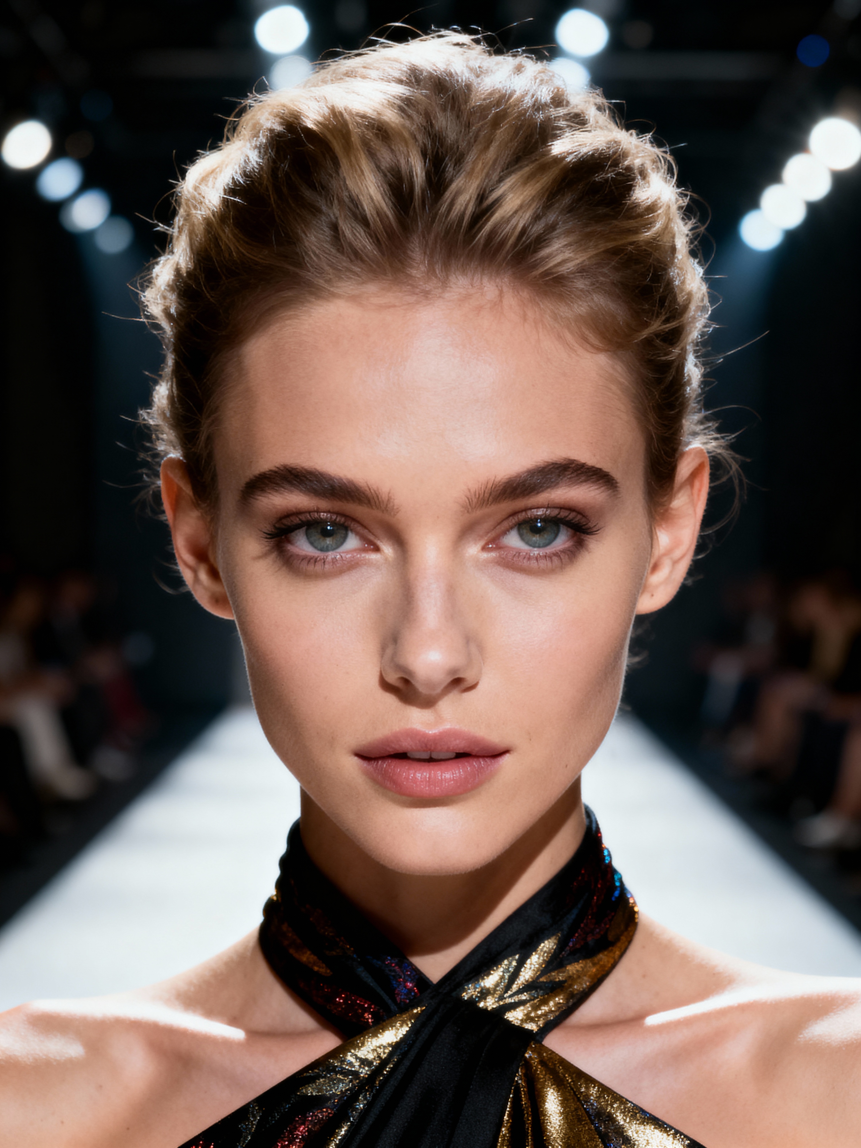 Professional fashion insanely beautiful model in a high-end studio. Wearing designer couture, perfect runway posture . Editorial lighting, fashion magazine quality.