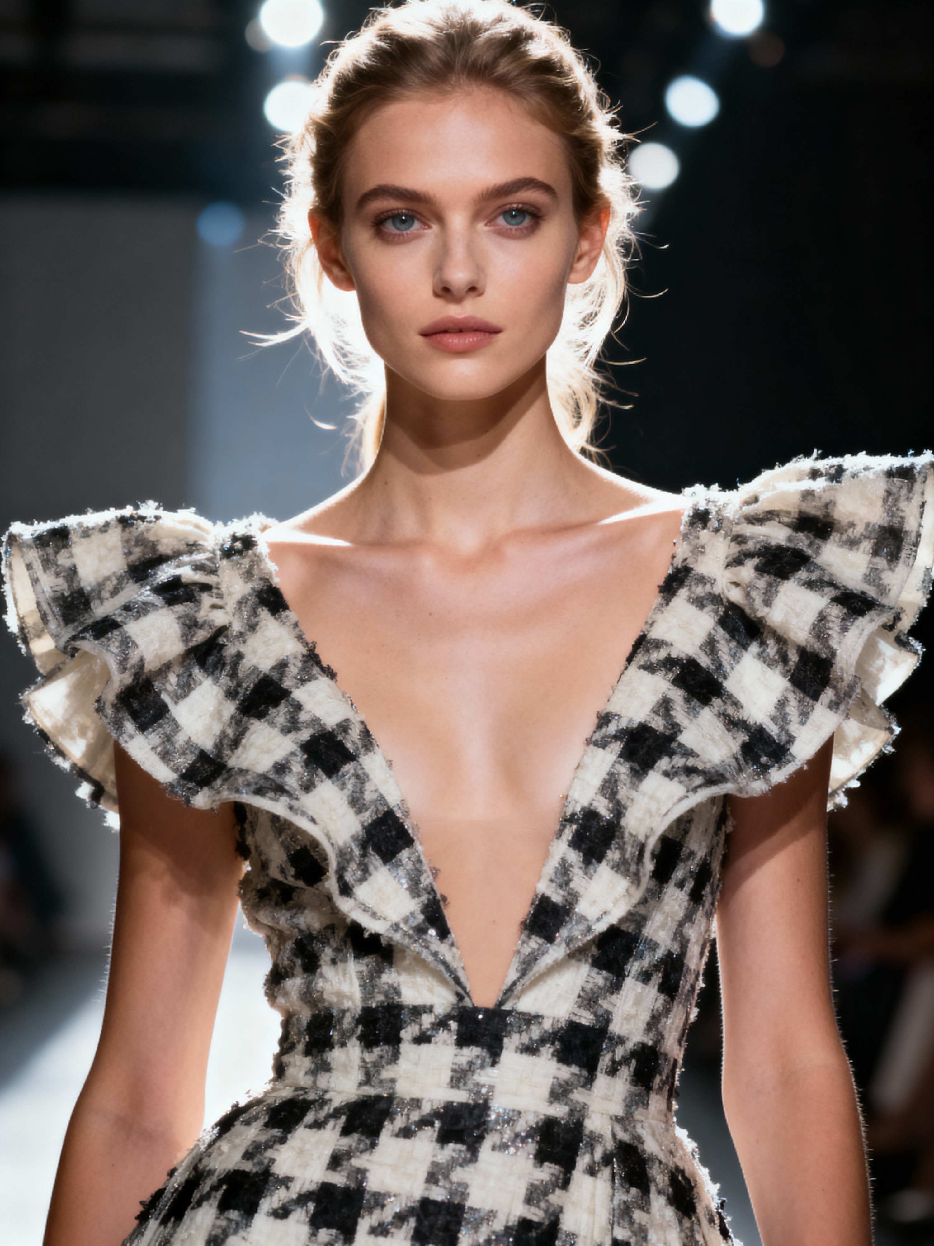 Professional fashion insanely beautiful model in a high-end studio. Wearing designer couture, perfect runway posture . Editorial lighting, fashion magazine quality.