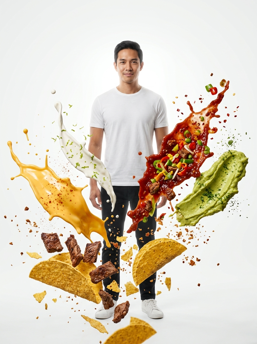 {"project_configuration":{"shot_type":"macro_slow_motion","global_settings":{"aspect_ratio":"9:16","chaos_weight":15,"color_profile":"high-key","environment":{"backdrop":"clean_white","lighting_style":"cinematic_bloom","atmosphere":"ethereal"}},"camera_optics":{"body":"Canon EOS R5","lens":"85mm f\/1.2","depth_of_field":"shallow_bokeh","focus_point":"solid_and_fluid_interaction"}},"scene_data":[{"id":"image_001","snack_component":{"type":"crispy_taco_shell_fragment","surface":"golden_crunchy","physics":"mid-air_floating"},"fluid_component":{"material":"melted_cheese_sauce","color":"warm_yellow","behavior":"upward_splash_arc","texture":"thick_glossy"},"particle_system":{"frozen_elements":"cheese_droplets","spices":["paprika_particles"],"debris":"hyper-detailed_tortilla_crumbs"}},{"id":"image_002","snack_component":{"type":"grilled_beef_taco_piece","surface":"seared_textured","physics":"hovering"},"fluid_component":{"material":"crema_sauce","color":"soft_white","behavior":"upward_burst","texture":"smooth_creamy"},"particle_system":{"frozen_elements":"soft_arc_droplets","spices":["lime_zest_particles"],"debris":"detailed_meat_and_tortilla_crumbs"}},{"id":"image_003","snack_component":{"type":"taco_filling_mix","surface":"colorful_veggies_and_meat","physics":"hovering"},"fluid_component":{"material":"spicy_red_salsa","color":"deep_red","behavior":"upward_eruption","texture":"chunky_glossy"},"particle_system":{"frozen_elements":"mid-flight_salsa_droplets","spices":["chili_flake_particles"],"debris":"soft_drifting_filling_bits"}},{"id":"image_004","snack_component":{"type":"tortilla_chip_cracker","surface":"textured_corn","physics":"suspended"},"fluid_component":{"material":"guacamole_cream","color":"avocado_green","behavior":"upward_splash","texture":"thick_smooth"},"particle_system":{"frozen_elements":"motion-frozen_droplets","spices":["coriander_dust"],"debris":"soft_drifting_corn_crumbs"}}]}
