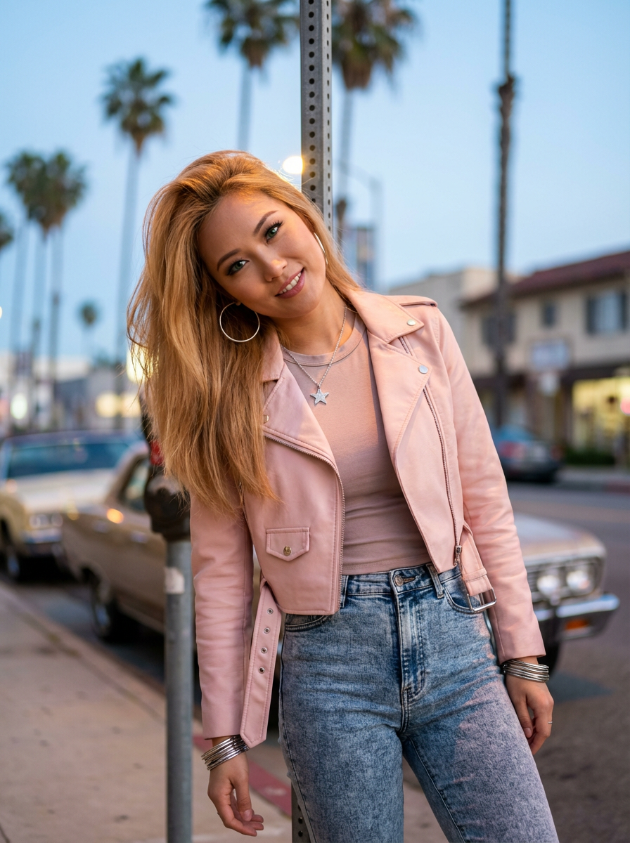 {"project": "Grease-Inspired Street Editorial", "version": "3.2", "intent": "Create a cinematic, hyperrealistic street fashion editorial inspired by Grease, portraying a confident young model radiating joy and timeless cool on a Los Angeles street.", "frame": {"aspect_ratio": "3:4", "composition": "Vertical editorial framing with elegant asymmetry", "shot_type": "Three-quarter to full-body shot", "camera_angle": "Eye-level, intimate perspective", "focal_point": "Eyes, facial expression, and flowing hair", "observer_relation": "Direct gaze with playful confidence"}, "subject": {"gender": "model", "age": 25, "presence": "Charismatic, confident, joyful", "expression": "Discrete, attractive smile — subtle, confident, magnetic", "gaze": "Looking at the camera despite tilted head, playful and self-assured", "emotion": "Joy, confidence, freedom", "pose": {"stance": "Standing close to a street light pole", "interaction": {"hand": "One hand gently touching or gripping the light pole", "head": "Head bent sideways"}, "body_language": "Relaxed hips, natural curve, effortless elegance"}, "hair": {"color": "warm blonde", "style": "Straight, lush, voluminous", "movement": "Hair hanging downward due to head tilt, flowing naturally with gravity", "details": "Individual strands catching warm street light highlights"}, "eyes": {"color": "emerald green", "detail": "Sharp focus with reflected city lights"}, "skin": {"texture": "High-detail natural skin with pores and micro-imperfections", "tone": "Warm neutral with cinematic glow"}}, "wardrobe_and_accessories": {"outfit_style_reference": "Grease (1978) – iconic 1950s street fashion", "top": {"base_layer": {"type": "fitted t-shirt", "fabric": "soft cotton", "fit": "body-hugging, timeless"}, "outer_layer": {"type": "leather jacket", "color": "soft pastel pink", "finish": "slightly glossy leather", "fit": "cropped, tailored, classic Grease silhouette"}}, "bottom": {"type": "tight high-waisted jeans", hair, "wash": "stone-washed", "texture": "visible denim grain with subtle fading", "fit": "skin-tight, emphasizing silhouette"}, "jewelry": {"primary_necklace": {"material": "silver", "pendant": "small silver star"}, "additional_jewelry": ["silver if(gender=f){hoop earrings } ", "thin silver bangles", "delicate silver rings"]}}, "environment": {"location": "Los Angeles street", "time_of_day": "Early evening / blue hour", "setting": {"element": "Classic metal street light pole", "interaction": "Hand contact grounding the pose"}, "background": {"elements": ["palm trees", "parked vintage cars", "low-rise buildings"], "treatment": "Strong background separation with creamy bokeh"}, "ambience": "Warm urban glow mixed with cool evening tones"}, "lighting": {"primary_light": "Street lamp casting warm directional light from above", "secondary_light": "Ambient city reflections", "effect": "Rim light accentuating hanging hair and jacket edges", "cinematic_quality": "Soft highlights, controlled shadows"}, "cinematography": {"lens": "85mm prime lens", "aperture": "f/1.8", "depth_of_field": "Very shallow, cinematic separation", "focus_behavior": "Eyes sharp despite head tilt, hair softly falling out of focus", "sensor_feel": "Full-frame cinematic realism"}, "post_processing": {"color_grading": "Warm-pink highlights with cool blue evening shadows", "contrast": "Editorial film contrast", "grain": "Subtle analog film grain", "imperfections": ["natural hair flyaways", "minor jacket creases", "light pole surface wear"]}, "mood_and_theme": {"mood": "Playful, confident, joyful", "theme": "Vintage Grease femininity expressed through modern urban freedom"}, "negative_prompt": ["curly hair", "stiff head position", "exaggerated smile", "plastic skin", "anime or cartoon style", "distorted anatomy", "extra fingers", "blurred eyes", "visible brand logos"], "output_quality": {"resolution": "8K", "realism_level": "Ultra-hyperrealistic", "style": "Cinematic street fashion editorial"}}