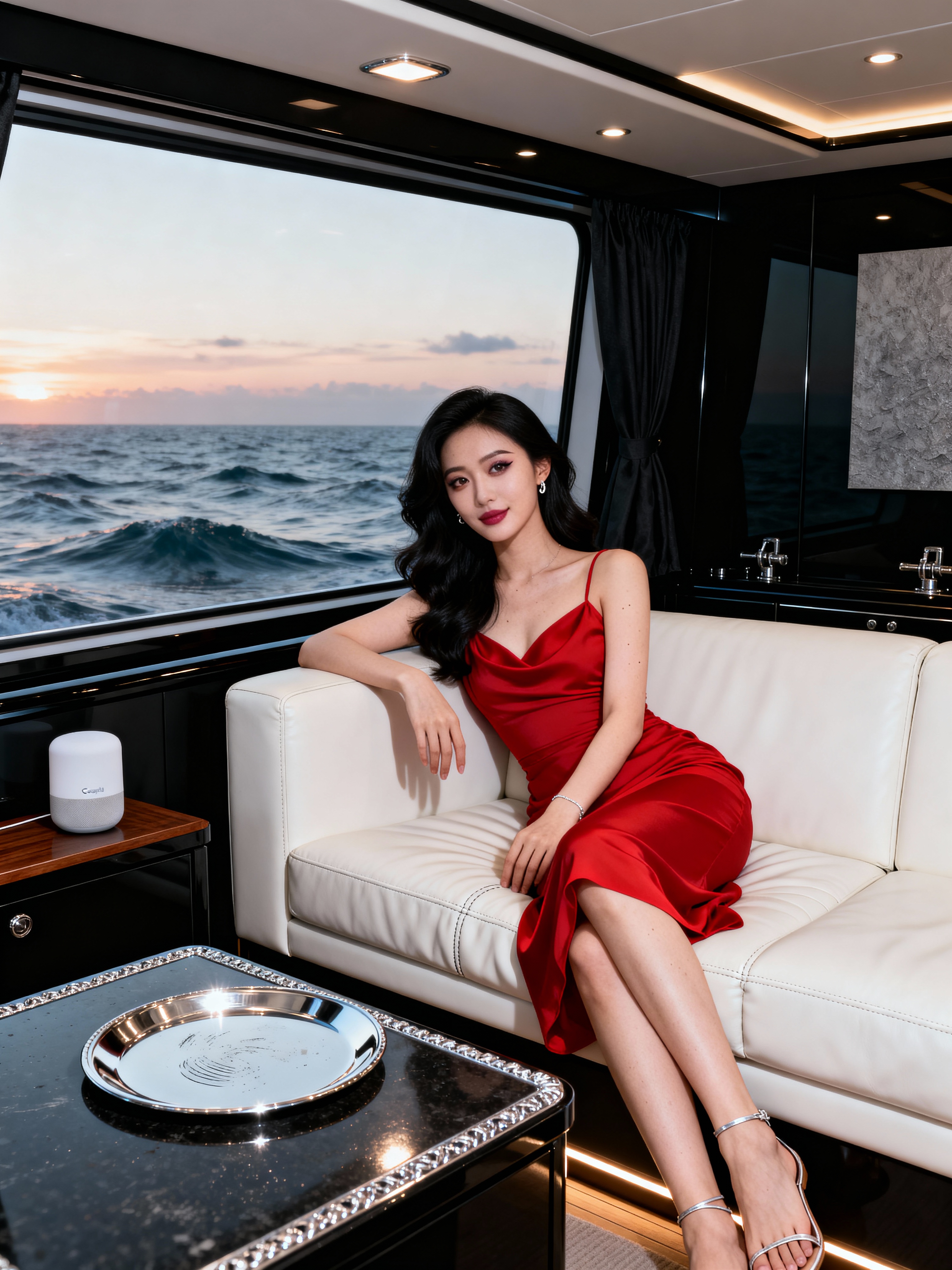 {"project": "Maximalist Editorial Yacht Cabin Scene", "version": "1.2", "intent": "Generate a hyperrealistic, high-end editorial image with STRICT identity preservation: the model must match the uploaded character reference 100% (same face, same hair, same makeup vibe). yacht cabin at evening, wavy sea visible through windows. Natural leather couch. Google Home on a corner side table. Polished silver plate on a chic table with silver ornament trim.", "references": {"required": true, "upload_instructions": {"character_reference": {"count": "1-3", "best_practice": ["Use 1 clean front-facing portrait (sharp eyes, neutral expression).", "Add 1 three-quarter angle portrait (same hairstyle).", "Optional: add 1 full-body reference if you need exact body/pose consistency."], "rules": ["Identity must match reference exactly: same facial structure, eyes, nose, lips, jawline, skin tone, beauty marks (if any).", "Do NOT change ethnicity, age range, or facial proportions.", "Do NOT change hairstyle color (jet black) or makeup style (smokey eye)."]}, "environment_reference": {"optional": true, "count": "0-1", "note": "If you want the cabin layout to match a specific yacht interior, upload 1 environment reference."}}, "identity_lock": {"strength": "maximum", "face_match": "strict", "hair_match": "strict", "makeup_match": "strict", "body_shape_consistency": "high", "no_face_drift": true, "no_style_drift": true}}, "output": {"quantity": 4, "aspect_ratio": "3:4", "resolution_hint": "8k", "format": "png", "safety": {"nsfw": "avoid_explicit_nudity", "age": "adult_25_plus"}}, "scene": {"location": {"type": "luxury_yacht_interior", "room": "owner_cabin_lounge", "time_of_day": "evening", "weather_outside": "wavy_sea_darkening_sky", "design_language": ["black_lacquer_panels_or_black_satin_wood", "black_trim_details", "cream_textiles_as_contrast", "subtle_nautical_details", "minimal_high_luxury"]}, "set_dressing": {"primary_furniture": {"item": "couch", "material": "natural_white_leather", "finish": "semi_matte_soft_sheen", "details": ["tight_stitching", "gentle_wrinkles_at_seat_pressure_points", "subtle_grain_visible", "slight_indentation_where_subject_reclines"]}, "tables": [{"role": "chic_table_near_couch", "style": "modern_luxury", "material": "lacquered_wood_or_stone_top", "trim": "silver_ornament_around_edge", "ornament_detail": ["fine_filigrane_pattern", "polished_edges_with_micro_scratches", "tasteful_not_flashy"], "items_on_table": [{"item": "silver_plate", "material": "polished_silver", "surface_characteristics": ["soft_reflections", "subtle_fingerprint_smudges", "hairline_micro_scratches", "specular_highlights"], "positioning": "centered_on_table_slightly_angled_toward_camera"}]}, {"role": "corner_side_table", "style": "compact_minimal", "placement": "corner_of_room", "items_on_table": [{"item": "Google Home", "type": "smart_speaker", "appearance": ["clean", "modern", "subtle_brand_presence_no_closeup_logo_focus"], "placement_note": "clearly visible but not dominant"}]}], "background_elements": ["panoramic_yacht_windows_showing_wavy_sea", "dark_sheer_curtains_partially_drawn", "discreet_marine_hardware_in_brushed_metal", "minimal_art_piece_or_textured_wall_panel", "black_yacht_interior_accents_and_trim"]}}, "subject": {"type": "model", "age": "late_20s", "identity_rules": ["MATCH CHARACTER REFERENCE EXACTLY (100%): same face, same eye shape, same nose, same lips, same jawline, same skin tone.", "NO identity drift across variations.", "Keep the subject clearly adult (25+)."], "hair": {hair, "style": "soft_waves", "details": ["a_few_flyaway_strands", "subtle_shine_not_plastic"]}, "face": {"expression": "calm_confident_slightly_playful", "makeup": {"style": "editorial_glam", "details": ["smokey_eye_makeup", "defined_lashes", "sculpted_brows", "soft_glow_skin", "neutral_to_deep_rose_lip", "no_heavy_glitter"]} , "skin_detail": ["realistic_pores", "fine_peach_fuzz", "subtle_under_eye_texture", "gentle_color_variation"]}, "body": {"pose": {"primary": "reclining_elegantly_on_couch", "legs": "naturally_crossed_or_one_leg_extended_relaxed", "arms": "one_arm_resting_on_backrest_other_relaxed_near_lap", "posture": "sensual_but_classy", "camera_readability": "three_quarter_or_full_body_visible"}, "wardrobe": {"outfit": "elegant_sexy_red_dress", "style_keywords": ["high_end_eveningwear", "form_fitting_elegant", "delicate_straps_or_asymmetric_cut", "tasteful_editorial_sensuality"], "fabric_behavior": ["soft_draping", "micro_folds", "realistic_tension_points", "subtle_satin_specular_if_any"], "accessories": [{"item": "minimal_silver_jewelry", "details": ["thin_bracelet_or_small_earrings", "no_large_logos"]}], "footwear": {"option": "barefoot_or_minimal_strappy_sandals", "note": "relaxed luxury yacht feel"}}}}, "composition": {"shot_type": "editorial_lifestyle", "framing": "vertical_3_4", "camera_angle": "slightly_above_eye_level_gentle_downward", "focal_point": ["nearest_eye_and_face", "red_dress_texture", "white_leather_grain", "silver_plate_highlights"], "depth_of_field": {"style": "shallow_to_medium", "background": "softly_blurred_but_recognizable_black_yacht_cabin_and_wavy_sea"}, "keep_in_frame": ["Google_Home_on_corner_table", "silver_plate_on_chic_table_with_silver_ornament", "wavy_sea_visible_through_windows"]}, "lighting": {"primary": {"type": "evening_window_light", "source": "large_yacht_windows", "quality": "soft_diffused_with_low_sun_glow", "direction": "side_light_from_window", "color_temperature": "warm_3800K_to_4200K"}, "secondary": {"type": "practical_lights", "sources": ["dimmed_recessed_ceiling_spots", "hidden_led_strips_under_cabinet_edges"], "purpose": "gentle_fill_and_luxury_glow"}, "specular_management": ["controlled_highlights_on_white_leather", "bright_but_not_clipped_reflections_on_silver_plate", "soft_catchlights_in_eyes"], "shadow_character": "soft_but_defined_contact_shadows"}, "camera": {"aesthetic": "high_end_fashion_editorial_photography", "lens": {"focal_length_mm": 50, "aperture": "f/