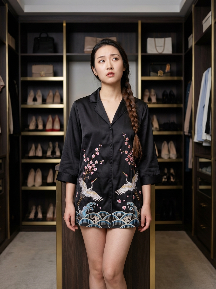 {"project": "Nano Banana - Editorial Interior Lifestyle Scene", "version": "4.0", "meta": {"creative_style": "Luxury Realism", "mood": "Introspective, fashion-forward, refined luxury", "aesthetic_keywords": ["luxury walk-in closet", "editorial fashion psychology", "designer interior lighting", "high-end womenswear", "modern elegance"]}, "scene": {"location": "Luxury walk-in closet inside a contemporary residence", "environment": {"layout": "Spacious walk-in wardrobe with symmetrical shelving on both sides", "wardrobe_contents": {"category": "Exclusively women’s wear", "dresses": "Evening dresses , silk gown s, minimalist day dresses arranged by color gradient", "tops": "Elegant shirts, blouse s, and delicate fabrics displayed with editorial spacing", "pants": "Tailored trousers and fashion-forward silhouettes", "shoes": "Heels, sandals, and designer footwear displayed on illuminated shelves", "accessories": "Handbag s, belts, and curated jewelry pieces displayed like a luxury boutique"}, "materials": ["dark matte wood cabinetry", "brushed brass and chrome accents", "soft textile panels", "polished stone flooring"]}}, "subject": {"type": "Beautiful model", "pose": "Standing confidently in the center of the walk-in closet, full body visible, weight subtly shifted", "head_position": "Slightly tilted head", "expression": "Thoughtful with a subtle hint of confusion, confident yet introspective", "gaze": "Looking slightly upward and to the side, as if considering a choice", "appearance": {"age": "25", "hair": {hair, "style": "Long braid resting over one shoulder, with a few loose strands softening the look"}, "skin": {"texture": "Soft, natural skin with refined editorial smoothness and realistic micro-detail"}, "clothing": {"outfit": "Very short, elegant silk shirt-style night gown ", "length": "Ultra-short hemline, fashion-forward and refined", "fabric_behavior": "Fluid silk with subtle movement and luxurious sheen", "motifs": ["Elegant colorful crane embroidery", "Delicate cherry blossom accents", "Refined wave-inspired patterns"], "pattern_style": "Colorful motifs used sparingly against deep silk for high-contrast luxury"}, "jewelry": {"necklace": "Delicate silver necklace with a refined pendant, subtly catching designer light"}}}, "lighting": {"lighting_style": "High-end designer lighting", "primary_light": "Architectural ceiling lights with controlled diffusion", "secondary_light": "Directional accent lighting sculpting the face, braid, and gown ", "light_behavior": ["Elegant highlights on cheekbones and collarbones", "Controlled reflections on silk fabric", "Soft shadow sculpting for editorial depth"], "imperfections": ["Natural light gradients", "Subtle highlight asymmetry", "Organic reflections across materials"]}, "camera": {"shot_type": "Full body editorial fashion portrait", "angle": "Eye-level with subtle cinematic offset", "lens": "50mm full-frame lens", "aperture": "f/2.2", "depth_of_field": "Moderate shallow depth of field with softly blurred wardrobe background", "focus_point": "Face and upper body, with full outfit clarity"}, "image_quality": {"resolution": "Ultra-high resolution", "texture_detail": ["silk micro-sheen", "Colorful motif embroidery", "Hair braid texture", "Luxury material finishes", "Natural skin realism"], "post_processing": ["Editorial color grading", "Soft cinematic contrast", "Fine film grain for realism"]}, "style_constraints": {"realism_level": "Photorealistic", "luxury_index": "Very high", "branding": "No logos, no text, no watermarks"}}