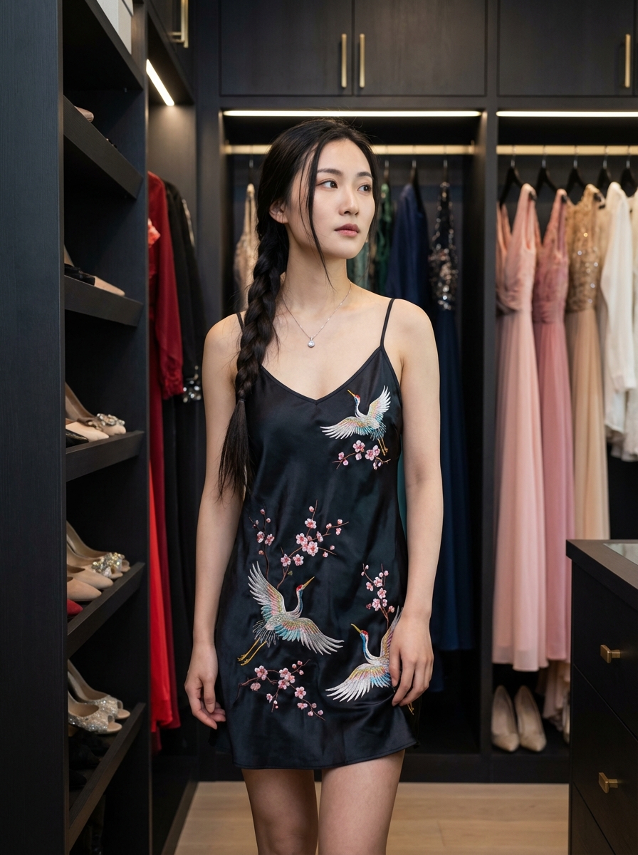 {"project": "Nano Banana - Editorial Interior Lifestyle Scene", "version": "4.0", "meta": {"creative_style": "Luxury Realism", "mood": "Introspective, fashion-forward, refined luxury", "aesthetic_keywords": ["luxury walk-in closet", "editorial fashion psychology", "designer interior lighting", "high-end womenswear", "modern elegance"]}, "scene": {"location": "Luxury walk-in closet inside a contemporary residence", "environment": {"layout": "Spacious walk-in wardrobe with symmetrical shelving on both sides", "wardrobe_contents": {"category": "Exclusively women’s wear", "dresses": "Evening dresses , silk gown s, minimalist day dresses arranged by color gradient", "tops": "Elegant shirts, blouse s, and delicate fabrics displayed with editorial spacing", "pants": "Tailored trousers and fashion-forward silhouettes", "shoes": "Heels, sandals, and designer footwear displayed on illuminated shelves", "accessories": "Handbag s, belts, and curated jewelry pieces displayed like a luxury boutique"}, "materials": ["dark matte wood cabinetry", "brushed brass and chrome accents", "soft textile panels", "polished stone flooring"]}}, "subject": {"type": "Beautiful model", "pose": "Standing confidently in the center of the walk-in closet, full body visible, weight subtly shifted", "head_position": "Slightly tilted head", "expression": "Thoughtful with a subtle hint of confusion, confident yet introspective", "gaze": "Looking slightly upward and to the side, as if considering a choice", "appearance": {"age": "25", "hair": {hair, "style": "Long braid resting over one shoulder, with a few loose strands softening the look"}, "skin": {"texture": "Soft, natural skin with refined editorial smoothness and realistic micro-detail"}, "clothing": {"outfit": "Very short, elegant silk shirt-style night gown ", "length": "Ultra-short hemline, fashion-forward and refined", "fabric_behavior": "Fluid silk with subtle movement and luxurious sheen", "motifs": ["Elegant colorful crane embroidery", "Delicate cherry blossom accents", "Refined wave-inspired patterns"], "pattern_style": "Colorful motifs used sparingly against deep silk for high-contrast luxury"}, "jewelry": {"necklace": "Delicate silver necklace with a refined pendant, subtly catching designer light"}}}, "lighting": {"lighting_style": "High-end designer lighting", "primary_light": "Architectural ceiling lights with controlled diffusion", "secondary_light": "Directional accent lighting sculpting the face, braid, and gown ", "light_behavior": ["Elegant highlights on cheekbones and collarbones", "Controlled reflections on silk fabric", "Soft shadow sculpting for editorial depth"], "imperfections": ["Natural light gradients", "Subtle highlight asymmetry", "Organic reflections across materials"]}, "camera": {"shot_type": "Full body editorial fashion portrait", "angle": "Eye-level with subtle cinematic offset", "lens": "50mm full-frame lens", "aperture": "f/2.2", "depth_of_field": "Moderate shallow depth of field with softly blurred wardrobe background", "focus_point": "Face and upper body, with full outfit clarity"}, "image_quality": {"resolution": "Ultra-high resolution", "texture_detail": ["silk micro-sheen", "Colorful motif embroidery", "Hair braid texture", "Luxury material finishes", "Natural skin realism"], "post_processing": ["Editorial color grading", "Soft cinematic contrast", "Fine film grain for realism"]}, "style_constraints": {"realism_level": "Photorealistic", "luxury_index": "Very high", "branding": "No logos, no text, no watermarks"}}