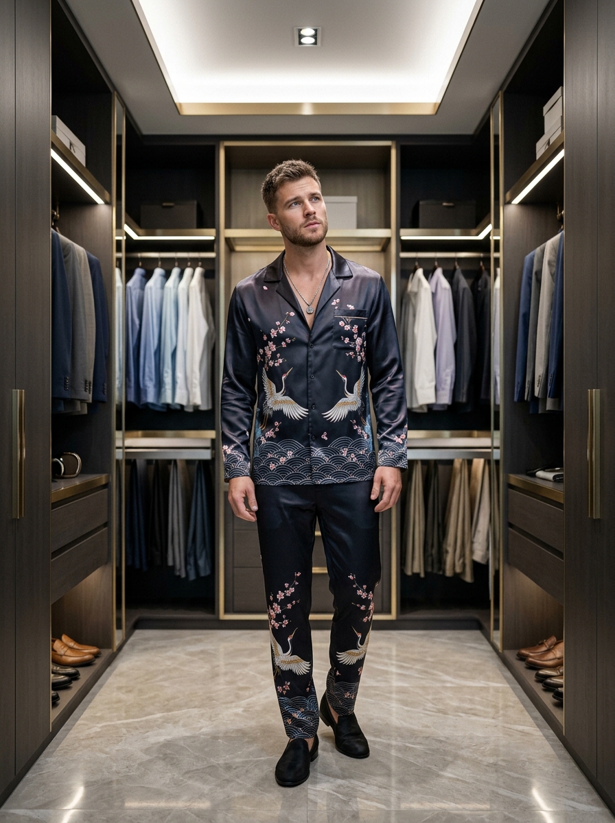 {"project": "Nano Banana - Editorial Interior Lifestyle Scene", "version": "4.0", "meta": {"creative_style": "Luxury Realism", "mood": "Introspective, fashion-forward, refined luxury", "aesthetic_keywords": ["luxury walk-in closet", "editorial fashion psychology", "designer interior lighting", "high-end menswear", "modern elegance"]}, "scene": {"location": "Luxury walk-in closet inside a contemporary residence", "environment": {"layout": "Spacious walk-in wardrobe with symmetrical shelving on both sides", "wardrobe_contents": {"category": "Exclusively men’s wear", "dresses": "fitted shirt and trousers, silk formal suits, minimalist day shirts arranged by color gradient", "tops": "Elegant shirts, button-up shirts, and delicate fabrics displayed with editorial spacing", "pants": "Tailored trousers and fashion-forward silhouettes", "shoes": "Loafers, derbies, and designer footwear displayed on illuminated shelves", "accessories": "minimal accessories, belts, and curated watch pieces displayed like a luxury boutique"}, "materials": ["dark matte wood cabinetry", "brushed brass and chrome accents", "soft textile panels", "polished stone flooring"]}}, "subject": {"type": "Handsome model", "pose": "Standing confidently in the center of the walk-in closet, full body , weight subtly shifted", "head_position": "Slightly tilted head", "expression": "Thoughtful with a subtle hint of confusion, confident yet introspective", "gaze": "Looking slightly upward and to the side, as if considering a choice", "appearance": {"age": "25", "hair": {"style": "Short textured crop resting neatly, with a few loose strands adding edge"}, "skin": {"texture": "Groomed skin with light stubble, refined editorial smoothness and realistic micro-detail"}, "clothing": {"outfit": "Very short, elegant silk shirt-style night formal suit", "length": "Slim tailored fit, fashion-forward and refined", "fabric_behavior": "Fluid silk with subtle movement and luxurious sheen", "motifs": ["Elegant colorful crane embroidery", "Delicate cherry blossom accents", "Refined wave-inspired patterns"], "pattern_style": "Colorful motifs used sparingly against deep silk for high-contrast luxury"}, "jewelry": {"necklace": "Masculine silver chain with a refined pendant, subtly catching designer light"}}}, "lighting": {"lighting_style": "High-end designer lighting", "primary_light": "Architectural ceiling lights with controlled diffusion", "secondary_light": "Directional accent lighting sculpting the face, hair, and formal suit", "light_behavior": ["Elegant highlights on cheekbones and jawline", "Controlled reflections on silk fabric", "Soft shadow sculpting for editorial depth"], "imperfections": ["Natural light gradients", "Subtle highlight asymmetry", "Organic reflections across materials"]}, "camera": {"shot_type": "Full body editorial fashion portrait", "angle": "Eye-level with subtle cinematic offset", "lens": "50mm full-frame lens", "aperture": "f/2.2", "depth_of_field": "Moderate shallow depth of field with softly blurred wardrobe background", "focus_point": "Face and upper body, with full outfit clarity"}, "image_quality": {"resolution": "Ultra-high resolution", "texture_detail": ["silk micro-sheen", "Colorful motif embroidery", "Short hair texture", "Luxury material finishes", "Natural skin realism"], "post_processing": ["Editorial color grading", "Soft cinematic contrast", "Fine film grain for realism"]}, "style_constraints": {"realism_level": "Photorealistic", "luxury_index": "Very high", "branding": "No logos, no text, no watermarks"}}}