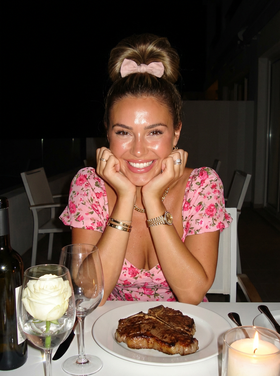 {"project": "Ultra-Realistic Portrait", "reference_settings": {"use_reference_image": true, "fidelity_strength": "100%", "instruction": "Face and outfit must match reference photo 100% with absolutely no alterations."}, "subject": {"demographics": "model", "focus_features": ["Eyes", "Nose", "Lips"], "expression": "Smiling, cute, fresh, dreamy, slightly sensual", "pose": "Sitting at a white table, resting chin on both hands, turning slightly", "hair": {"style": "Straight, large top bun", "accessory": "Bow matching the outfit", "texture": "Soft layered, loose strands falling naturally across face", "movement": "Slightly blown by wind"}, "makeup": {"cheeks": "Natural blush on cheeks and nose", "lips": "Full lips, soft pink-peach tone"}}, "fashion_and_accessories": {"outfit": "Exact match to reference image", "shoes": "High-heel shoes (matching reference)", "bag": "Same bag as reference photo", "jewelry": {"necklace": "Thin gold with alternating charms (heart, crescent moon, Gucci pendant)", "bracelet": "Delicate Gucci bracelet with charms", "rings": "Gold rings", "watch": "Steel-band Patek Philippe", "earrings": "Small gold Gucci earrings"}}, "environment": {"location": "Luxury hotel terrace / Seaside", "time_of_day_options": ["Option A: Deep blue evening sky, stars, shooting star, moonlight", "Option B: Early sunrise, orange-yellow sky tones"], "background_elements": ["Warm reflections from luxury hotel", "Calm seascape"]}, "props": {"table_setting": "White table", "items": ["Glass with a single white rose", "Wine glass", "Wine bottle", "Plate set with knife and fork", "Large T-bone steak in center", "Candle glass (adding warm highlight)"]}, "photography_style": {"aesthetic": "2000s digital-camera flash style", "lighting": "Realistic flash brightness, warm tone, slight shine on skin", "mood": "Relaxing, warm, nostalgic, stylish, elegant, slightly sexy", "shot_type": "Close-up portrait"}, "technical_parameters": {"aspect_ratio": "3:4", "detail_level": "8k", "style_tags": ["photo", "realistic", "flash photography"]}}
