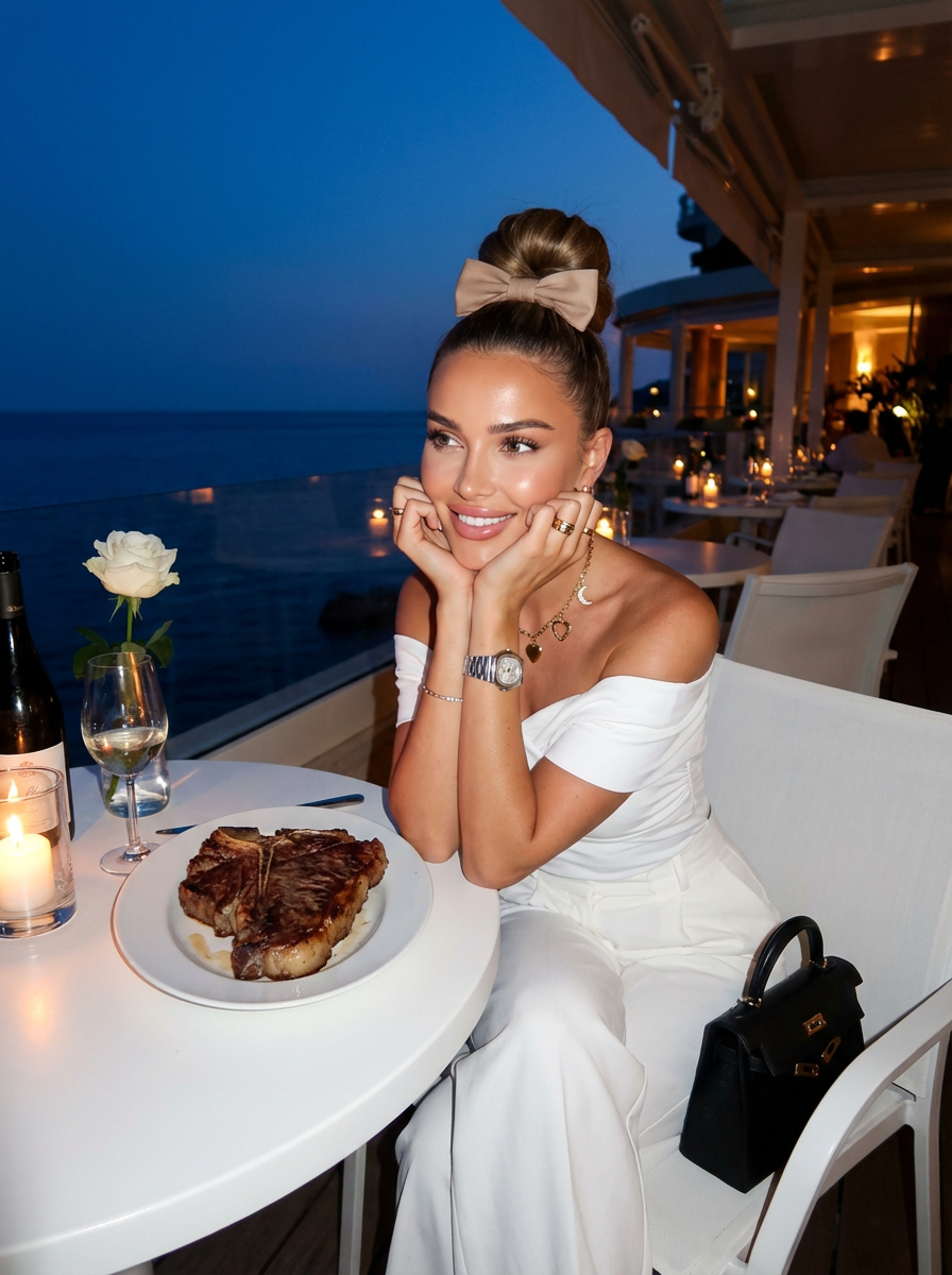 {"project": "Ultra-Realistic Portrait", "reference_settings": {"use_reference_image": true, "fidelity_strength": "100%", "instruction": "Face and outfit must match reference photo 100% with absolutely no alterations."}, "subject": {"demographics": "model", "focus_features": ["Eyes", "Nose", "Lips"], "expression": "Smiling, cute, fresh, dreamy, slightly sensual", "pose": "Sitting at a white table, resting chin on both hands, turning slightly", "hair": {"style": "Straight, large top bun", "accessory": "Bow matching the outfit", "texture": "Soft layered, loose strands falling naturally across face", "movement": "Slightly blown by wind"}, "makeup": {"cheeks": "Natural blush on cheeks and nose", "lips": "Full lips, soft pink-peach tone"}}, "fashion_and_accessories": {"outfit": "Exact match to reference image", "shoes": "High-heel shoes (matching reference)", "bag": "Same bag as reference photo", "jewelry": {"necklace": "Thin gold with alternating charms (heart, crescent moon, Gucci pendant)", "bracelet": "Delicate Gucci bracelet with charms", "rings": "Gold rings", "watch": "Steel-band Patek Philippe", "earrings": "Small gold Gucci earrings"}}, "environment": {"location": "Luxury hotel terrace / Seaside", "time_of_day_options": ["Option A: Deep blue evening sky, stars, shooting star, moonlight", "Option B: Early sunrise, orange-yellow sky tones"], "background_elements": ["Warm reflections from luxury hotel", "Calm seascape"]}, "props": {"table_setting": "White table", "items": ["Glass with a single white rose", "Wine glass", "Wine bottle", "Plate set with knife and fork", "Large T-bone steak in center", "Candle glass (adding warm highlight)"]}, "photography_style": {"aesthetic": "2000s digital-camera flash style", "lighting": "Realistic flash brightness, warm tone, slight shine on skin", "mood": "Relaxing, warm, nostalgic, stylish, elegant, slightly sexy", "shot_type": "Close-up portrait"}, "technical_parameters": {"aspect_ratio": "3:4", "detail_level": "8k", "style_tags": ["photo", "realistic", "flash photography"]}}