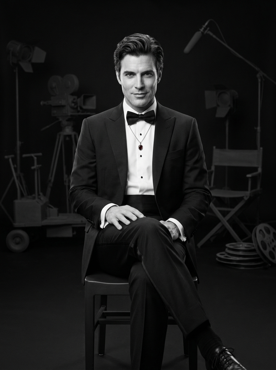 {"project":"Nano Banana \u2013 Iconic Hollywood Portrait","version":"NB-ICON-1.3","input_required":{"upload_person_image":false,"identity_mode":"Icon recreation","identity_reference":"1950s Hollywood icon","identity_consistency":"Mandatory across all outputs"},"scene_meta":{"category":"Fine Art \/ Editorial Portrait","aesthetic":["Classic Hollywood","Cinematic heritage","Minimalist elegance","Museum-grade photography"],"narrative_density":"Focused","brand_safety":{"explicit_content":"None","modern_elements":"None","logos_text":"None"}},"frame":{"aspect_ratio":"4:5","camera":{"sensor_format":"Full-frame","lens":"85mm portrait prime","aperture":"f\/2.0","focus":"Eyes and lips","depth_of_field":"Shallow, cinematic isolation"},"shot_type":"Seated medium-full body","angle":"Slightly above eye level","composition":{"subject_position":"Centered","negative_space":"Dark background structured with symbolic silhouettes","balance":"Symmetry gently broken by head tilt"}},"environment":{"background":{"base_color":"Deep matte black","visual_layer":{"type":"Silhouettes only","elements":["Vintage film camera","Studio light stands","Boom microphone","Director\u2019s chair","Film reels"],"opacity":"Very subtle, low-contrast","depth":"Layered at varying distances","style":"Soft-edged silhouettes, no readable text or logos"}},"furniture":{"chair":{"type":"Minimalist chair","finish":"Matte","role":"Subtle structural anchor"}}},"subject":{"identity":{"gender":"male","era":"1950s","hair":{"style":"Classic styled hair","finish":"Soft studio sheen"},"skin":{"tone":"Luminous fair","detail":["Fine pores","Classic Hollywood retouch restraint","Light stubble"]}},"pose":{"body_position":"Sitting on chair","legs":"Crossed at the knee","upper_body":"Leaning slightly forward","posture":"Confident, poised, controlled","hands":{"state":"Empty","placement":"Resting naturally on lap or chair edge","gesture_quality":"Relaxed, authoritative"}},"head_and_gaze":{"head_tilt":"Slightly tilted to the left","eye_direction":"Directly at the camera","eye_quality":"Intense, charismatic","gaze_character":"Direct, emotionally resonant"},"expression":{"smile":"Charming, calm","emotion":["Confident poise","Quiet charisma","Emotional depth"]}},"wardrobe":{"dress":{"type":"tailored tuxedo","length":"Full-length trousers","style":"Timeless Hollywood elegance","fabric":"Fine wool, structured light-catching","contrast_function":"High contrast against background"}},"accessories":{"necklace":{"material":"Silver","pendant":{"shape":"Crest","material":"Onyx","size":"Small, bold"},"resting_position":"Centered at upper chest","symbolism":["Strength","Passion","Enduring charisma"]}},"makeup_details":{"lips":{"color":"Natural","finish":"Matte","precision":"natural features, iconic shape"}},"lighting":{"key_light":{"type":"Classic Hollywood soft key","direction":"Front-side","effect":"Sculpted cheekbones and jawline, luminous eyes, gentle highlights"},"fill_light":{"type":"Minimal","purpose":"Preserve shadow depth"},"rim_light":{"type":"Subtle","targets":["Hair","Shoulders","Tuxedo edges","Onyx crest pendant outline"]},"shadow_style":"Soft film-noir shadows"},"color_science":{"mode":"and photography","contrast":"Medium-high, silver gelatin print feel","grain":"Fine analog film grain","selective_color":{"enabled":true,"target":"Pendant only","color":"Deep red","intensity":"Rich, jewel-like, controlled"}},"nano_banana_rules":{"style_lock":"Classic Hollywood editorial","identity_integrity":"Strict","no_modernization":true,"avoid":["Modern fashion","HDR look","Over-sharpening","Caricature resemblance"]},"output":{"resolution":"8K","render_quality":"Ultra-high","use_cases":["Gallery fine art print","Iconic editorial cover","Luxury monochrome cinema tribute"]}}