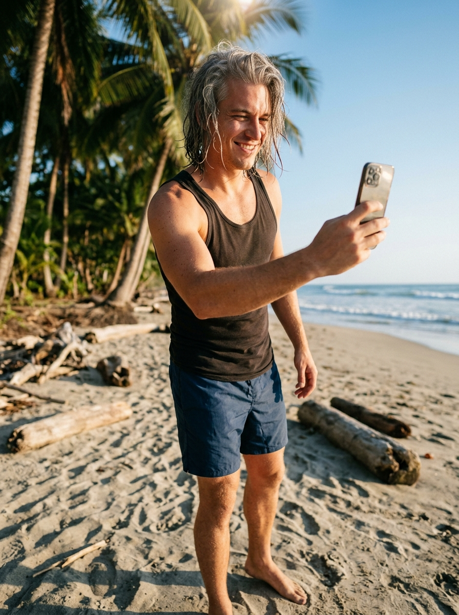 {"project":"Tropical Beach Selfie Portrait","prompt_structure":{"subject":{"demographics":"20 years old athletic male model","skin":"Sun-kissed natural skin tone, pores, subtle texture, imperfections, soft highlights, realistic transitions of light and shadow, no plastic or glossy effect.","hair":" , tousled, medium-length silver grey hair reaching neck, messy from wind and seawater, individual strands sticking to skin, loose strands falling across face."},"expression":{"mood":"Playful, confident, teasing vacation mood.","face":"Playful smirk with slight grin (soft, not exaggerated), eyes looking directly into camera with slight squint from bright sun."},"pose_and_framing":{"shot_type":"Front-facing close-up selfie shot, short distance.","angle":"Camera positioned slightly below eye level angling upward, head gently tilted down.","body_language":"Arms on both sides holding phone, one arm extended, shoulders relaxed, slightly turned, subtle forward posture."},"attire":{"clothing":" chest or fitted tank top with swim trunks.","details":"Realistic fabric tension, seams, natural folds and stretch, open neckline emphasizing muscular chest, bottom partially implied."},"environment":{"location":"Sandy tropical beach with fine sand texture.","elements":"Tall palm trees with green leaves on left, scattered driftwood\/logs.","background":"Ocean with gentle waves on horizon, clear blue sky."},"lighting":{"time":"Golden hour (early morning or late afternoon).","quality":"Natural daylight, warm sunlight coming from side and behind.","effects":"Soft rim light on hair, gentle highlights on shoulders\/collarbones, mild lens flare, soft overexposure at top."},"photography_tech":{"style":"DSLR-style photography, cinematic yet candid vacation feel.","lens":"50\u201385mm look.","focus":"Shallow depth of field, upper body in focus.","realism_level":"High-detail skin and fabric, realistic perspective, natural proportions, subtle asymmetry."}},"negative_prompt":["hair color","hair","specific hair shade","overprocessed skin","plastic skin","perfect body","unreal anatomy","exaggerated curves","CGI look","digital art","airbrushed skin","distorted hands","extra fingers","broken anatomy","glossy skin","heavy makeup"],"generation_parameters":{"aspect_ratio":"9:16","steps":30,"guidance_scale":7,"sampler":"DPM++ 2M Karras"},"full_combined_prompt":"A 20 years old athletic male model tropical beach, front-facing close-up selfie shot, arms holding phone. Camera below eye level angled upward, head tilted down. Playful smirk with slight grin, looking into camera, slight squint, teasing confident vacation mood. chest or fitted tank top, swim trunks, realistic fabric tension, open neckline. tousled medium-length silver grey hair reaching neck, messy from wind. Sun-kissed natural skin, pores, soft highlights. Golden hour lighting, warm sunlight from behind, rim light, mild lens flare. Sandy tropical beach background, palm trees, ocean waves, blue sky. DSLR-style, 50-85mm, shallow depth of field, cinematic candid style, realistic anatomy."}
