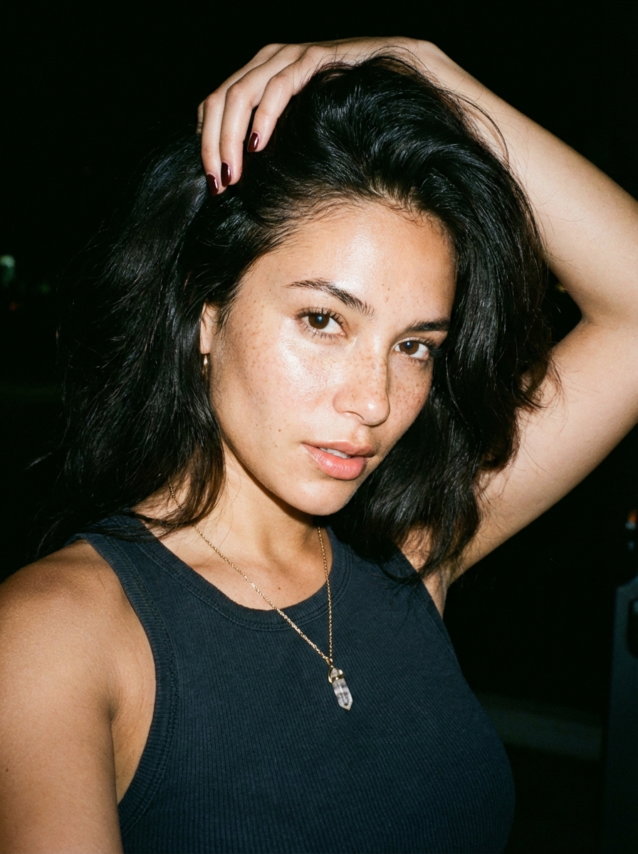 {"prompt_configuration": {"type": "Ultra Photorealistic Portrait", "aspect_ratio": "3:4", "version": "v6.0"}, "subject_details": {"demographics": "young model, mid-20s", "hair": "Voluminous dark hair, long and wavy, swept back with hand, high shine and texture, slightly messy 'bedroom hair' look", "skin": "Natural, visible skin texture including pores and peach fuzz, scattered natural freckles across nose and cheeks, dewy and hydrated finish, small beauty mark near upper lip", "facial_features": "Defined high cheekbones, full glossy lips in neutral rose tone, groomed brushed-up eyebrows, captivating dark brown eyes, sharp jawline", "nails": "Manicured fingernails painted dark cherry red"}, "apparel_and_accessories": {"clothing": "ribbed cotton tank top featuring a deep scoop neckline (partial view)", "jewelry": "Delicate gold chain necklace with a small crystal pendant", "styling": "Night-out glamour, effortless chic, 'it model' aesthetic"}, "pose_and_expression": {"pose": "Close-up portrait, right arm raised with hand running fingers through hair at the crown, head slightly tilted, intimacy of a candid moment", "expression": "Direct eye contact, alluring and confident gaze, slightly parted lips, seductive but composed"}, "environment_and_background": {"setting": "Indistinguishable dark void, suggesting a nighttime event, club entrance, or street at night", "background_elements": "Pitch with minimal depth, focusing entirely on the subject"}, "lighting_and_atmosphere": {"lighting_style": "Direct on-camera flash photography (Paparazzi style), hard lighting", "qualities": "High contrast, sharp fall-off into darkness, specular highlights on forehead, nose, and cheeks, bright illumination of the face", "mood": "Seductive, mysterious, candid, high-energy nightlife"}, "camera_and_technical": {"camera_woman": "Canon EOS 1V or Contax T2", "film_stock": "Kodak Portra 800 or Fujifilm Superia 400 emulation", "lens": "35mm prime lens", "settings": "Aperture f/2.8, Shutter 1/60, ISO 800, Flash ON", "visual_fidelity": "8k resolution, raw photo quality, sharp focus on eyes, slight chromatic aberration, organic film grain"}}