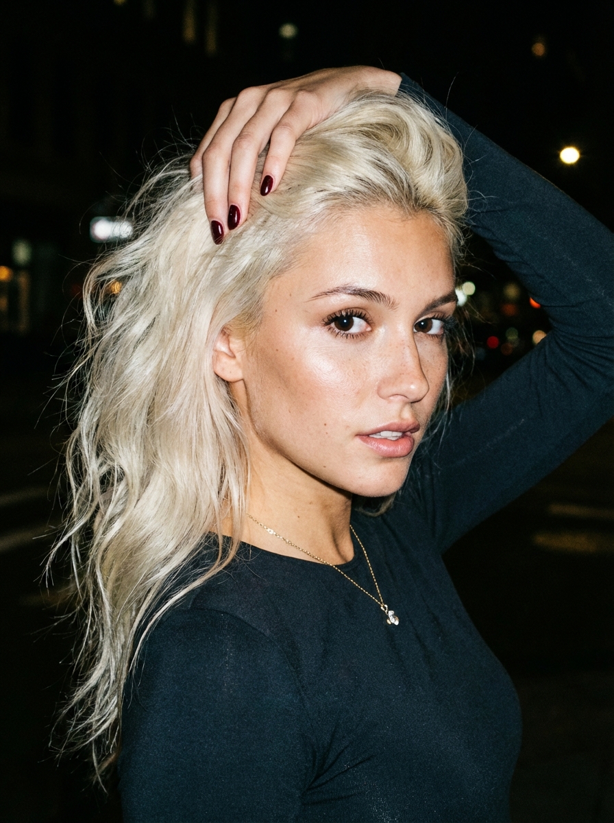 {"prompt_configuration": {"type": "Ultra Photorealistic Portrait", "aspect_ratio": "3:4", "version": "v6.0"}, "subject_details": {"demographics": "Beautiful young, mid-20s, athletic full hourglass figure ", "hair": "Voluminous platinum hair, long and wavy, swept back with hand, high shine and texture, slightly messy 'bedroom hair' look", "skin": "Natural fair, visible skin texture including pores and peach fuzz, scattered natural freckles across nose and cheeks, dewy and hydrated finish, small beauty mark near upper lip", "facial_features": "Defined high cheekbones, full glossy lips in neutral rose tone, groomed brushed-up eyebrows, captivating dark brown, sharp jawline", "nails": "Manicured fingernails painted dark cherry red"}, "apparel_and_accessories": {"clothing": "Form-fitting latex clubbing outfit featuring a deep neckline, high-gloss finish accentuating the physique (partial view)", "jewelry": "Delicate gold chain necklace with a small crystal pendant", "styling": "Night-out glamour, effortless chic, 'it model' aesthetic"}, "pose_and_expression": {"pose": "Close-up portrait, right arm raised with hand running fingers through hair at the crown, head slightly tilted, intimacy of a candid moment", "expression": "Direct eye contact, alluring and confident gaze, slightly parted lips, seductive but composed"}, "environment_and_background": {"setting": "Indistinguishable dark void, suggesting a nighttime event, club entrance, or street at night", "background_elements": "Pitch with minimal depth, focusing entirely on the subject"}, "lighting_and_atmosphere": {"lighting_style": "Direct on-camera flash photography (Paparazzi style), hard lighting", "qualities": "High contrast, sharp fall-off into darkness, specular highlights on forehead, nose, and cheeks, bright illumination of the face", "mood": "Seductive, mysterious, candid, high-energy nightlife"}, "camera_and_technical": {"camera_woman": "Canon EOS 1V or Contax T2", "film_stock": "Kodak Portra 800 or Fujifilm Superia 400 emulation", "lens": "35mm prime lens", "settings": "Aperture f/2.8, Shutter 1/60, ISO 800, Flash ON", "visual_fidelity": "8k resolution, raw photo quality, sharp focus on eyes, slight chromatic aberration, organic film grain"}}