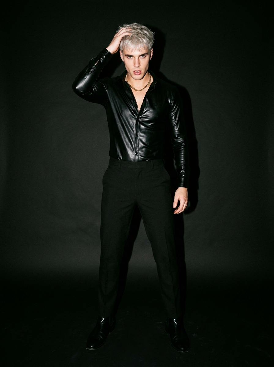 {"prompt_configuration":{"type":"Ultra Photorealistic Portrait","aspect_ratio":"3:4","version":"v6.0"},"subject_details":{"demographics":"Handsome young, mid-20s, athletic build","hair":"Short platinum hair, textured and tousled, swept back with hand, high shine, slightly messy 'bedroom hair' look","skin":"Natural fair, skin texture including pores and light stubble, scattered natural freckles across nose and cheeks, hydrated finish, small mole near upper lip","facial_features":"Defined high cheekbones, full lips, groomed brushed-up eyebrows, captivating dark brown eyes, sharp jawline","nails":"Short clean fingernails"},"apparel_and_accessories":{"clothing":"Form-fitting latex clubbing shirt featuring a deep V-neckline, high-gloss finish accentuating the physique (partial view)","jewelry":"Thick gold chain necklace","styling":"Night-out style, effortless cool, 'it guy' aesthetic"},"pose_and_expression":{"pose":"Close-up portrait, right arm raised with hand running fingers through hair at the crown, head slightly tilted, intimacy of a candid moment","expression":"Direct eye contact, intense and confident gaze, slightly parted lips, composed"},"environment_and_background":{"setting":"Indistinguishable dark void, suggesting a nighttime event, club entrance, or street at night","background_elements":"Pitch with minimal depth, focusing entirely on the subject"},"lighting_and_atmosphere":{"lighting_style":"Direct on-camera flash photography (Paparazzi style), hard lighting","qualities":"High contrast, sharp fall-off into darkness, specular highlights on forehead, nose, and cheeks, bright illumination of the face","mood":"Seductive, mysterious, candid, high-energy nightlife"},"camera_and_technical":{"camera_man":"Canon EOS 1V or Contax T2","film_stock":"Kodak Portra 800 or Fujifilm Superia 400 emulation","lens":"35mm prime lens","settings":"Aperture f\/2.8, Shutter 1\/60, ISO 800, Flash ON","visual_fidelity":"8k resolution, raw photo quality, sharp focus on eyes, slight chromatic aberration, organic film grain"}}