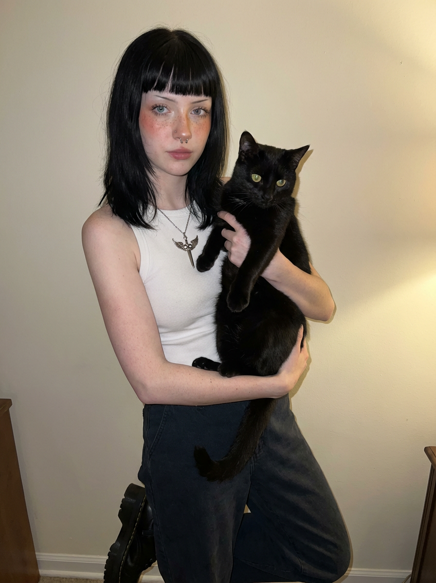 {"prompt_data": {"subject": {"demographics": "Young model, approximately late teens to early 20s", "hair": "Jet black, shoulder-length, straight texture with full bangs (fringe) covering the forehead", "skin": "Pale, fair complexion featuring scattered freckles across the nose and cheeks, with a noticeable rosy blush", "eyes": "Striking light blue/grey eyes, accented with sharp black winged eyeliner and mascara", "expression": "Neutral, soft gaze looking directly into the camera lens"}, "companion": {"animal": "Black kitten/cat", "features": "Solid black fur, yellow-green eyes", "interaction": "Held closely against the subject's face (cheek-to-cheek), with the subject's hand gently supporting the cat's chest/neck area"}, "styling": {"apparel": "White ribbed sleeveless tank top (undershirt style)", "jewelry": "Silver chain necklace featuring a pendant of a sword/dagger with angel wings and an eye motif in the center", "piercings": ["Silver septum ring (circular barbell)", "Small silver stud piercing on the nostril"]}, "environment": {"setting": "Indoor domestic setting", "background": "Plain beige or cream-colored wall", "lighting": "Warm, dim artificial light (likely lamp light) creating soft shadows and a cozy, slightly moody atmosphere"}, "technical_specs": {"angle": "Close-up selfie portrait", "aesthetic": "Soft grunge, e-girl style, high contrast between dark hair and pale skin", "focus": "Sharp focus on the face and cat, slightly softer background"}}}