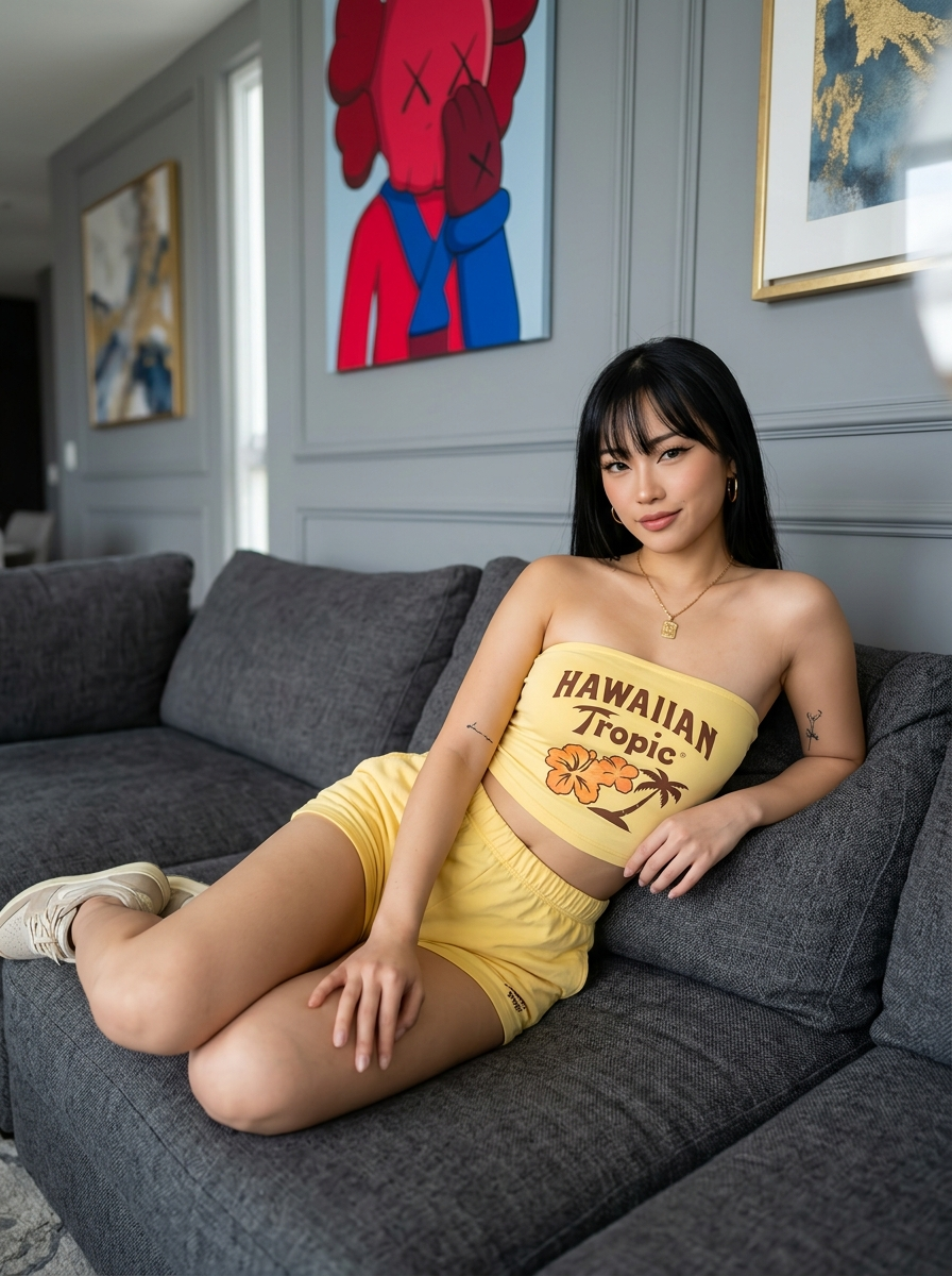{"prompt_data": {"subject": {"description": "Young in her 20s with a Y2K-inspired cool, playful, confident beauty.", "features": " skin, cool undertone, high-contrast K-pop idol inspired makeup, glossy gradient lips, sharp jawline with a refined V-shape face, high-visual-impact beauty.", "expression": {"eyes": {"look": "large sharp fox-eyes, confident gaze directed toward the camera", "energy": "cool, playful, slightly teasing", "details": "K-pop idol style eyeliner , emphasized aegyosal"}, "mouth": {"position": "relaxed lips with a subtle smirk", "energy": "effortlessly cool"}, "overall": "high-impact yet relaxed Y2K-influenced beauty expression"}, "hair": {hair, "style": "long sleek straight hair with perfectly straight, neatly trimmed bangs", "effect": "glossy, clean, fashion-forward finish"}, "accessories": "Gold pendant necklace, small gold if(gender=f){hoop earrings } , small minimalist tattoo on the left inner forearm."}, "clothing": {"outfit": "Matching yellow two-piece loungewear set.", "top": "Yellow strapless tube top featuring the text 'HAWAIIAN TROPIC' in brown serif font with a hibiscus flower and palm graphic on the side.", "bottoms": "Matching yellow shorts at the waist and area."}, "pose_and_action": {"posture": "Reclining and lounging comfortably on a grey textured sofa.", "body_language": "Relaxed and casual, leaning back into the couch cushions, one arm extended to support her weight, the other resting lightly near her waist, legs angled naturally toward the camera.", "expression": "Calm, confident eye contact with a subtle playful undertone."}, "environment": {"setting": "Modern living room interior.", "furniture": "Dark grey fabric sofa with a textured weave.", "background": "Grey walls with decorative panel molding (wainscoting).", "decor": "A large vertical art piece with a red background featuring KAWS-style figures in blue and black. A second framed abstract art piece with gold and tones. A modern linear wall sconce light."}, "lighting": {"type": "Soft, diffused indoor lighting.", "quality": "Warm ambient light balanced with soft shadows, gently enhancing facial structure, makeup contrast, and smooth skin texture."}, "styling_and_mood": {"aesthetic": "Influencer lifestyle with subtle Y2K influence, relaxed home setting.", "mood": "Chill, playful, quietly confident, and stylish."}, "camera_specifications": {"angle": "Eye-level, slightly angled from the side.", "focus": "Sharp focus on the subject’s face and upper , shallow depth of field softly blurring background artwork.", "lens_suggestion": "35mm or 50mm portrait lens.", "film_grain": "Low to medium ISO for a clean yet organic digital look."}, "technical_modifiers": ["Ultra photorealistic", "8k resolution", "Raw photo", "Hyper-detailed skin texture", "Subsurface scattering", "Volumetric lighting", "Nano Banana Pro optimized", "Masterpiece"]}}