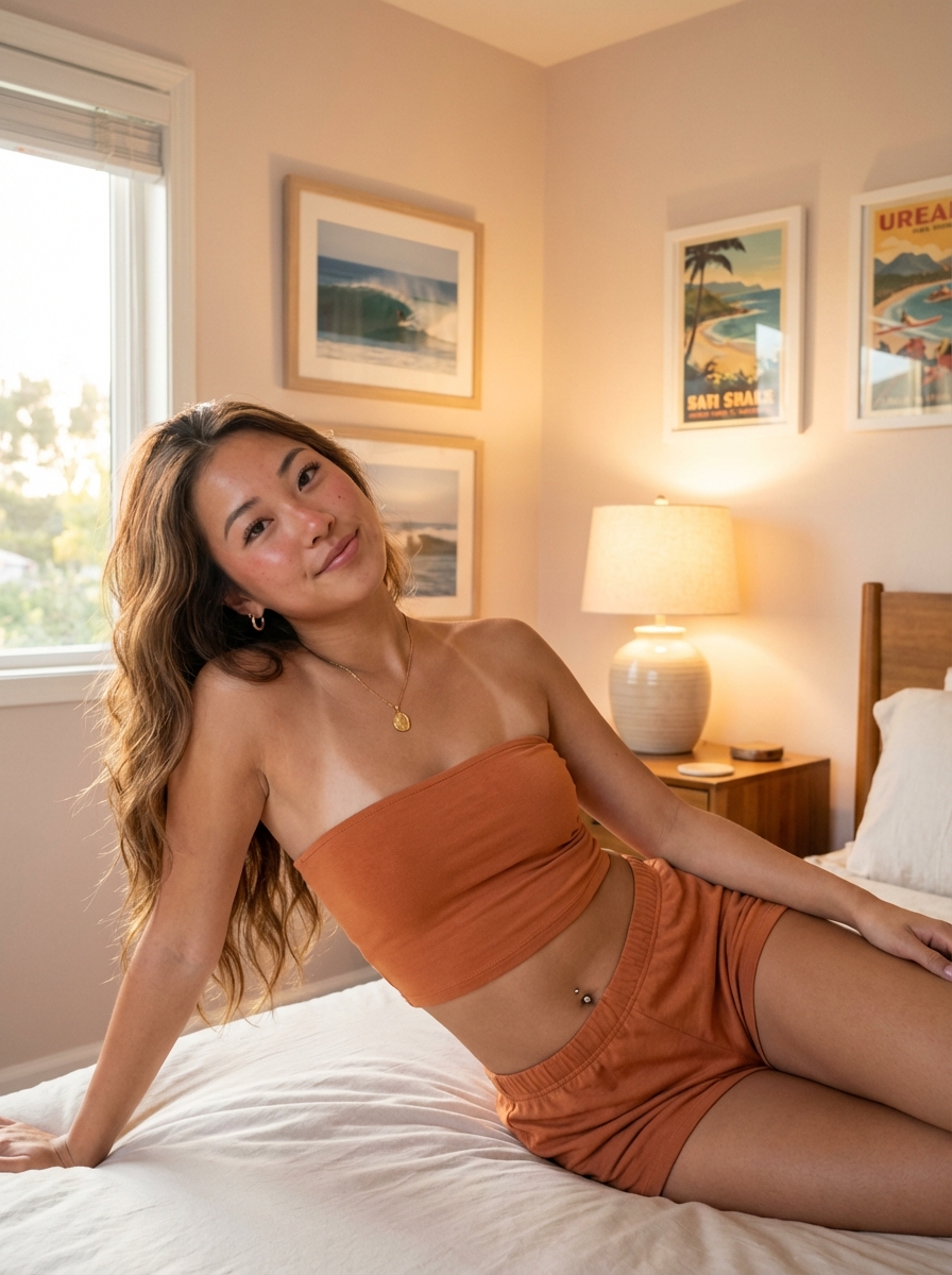 {"prompt_data": {"subject": {"description": "young model with long, wavy hair and a light ", "features": "Natural skin texture with visible tan lines on the chest, slight flush on cheeks, soft smile, navel piercing, light freckles.", "accessories": "Gold pendant necklace, small gold if(gender=f){hoop earrings } ."}, "clothing": {"outfit": "Bright retro-inspired two-piece loungewear set.", "top": "Vibrant Coppertone-orange strapless tube top with a clean, minimal front and no visible text or logos, emphasizing bold color and fabric texture.", "bottoms": "Matching Coppertone-orange lounge shorts with a soft elastic waistband, sitting low on the waist and visible at the hips and upper thighs."}, "pose_and_action": {"posture": "Reclining casually across the bed rather than sitting upright.", "body_language": "Relaxed but playful, torso angled toward the camera, one arm propped behind her for balance while the other rests loosely on her thigh, legs casually bent and angled forward.", "expression": "Confident, relaxed, subtly playful eye contact without exaggerated excitement."}, "environment": {"setting": "Stylish modern bedroom with warm retro-coastal influences.", "furniture": "Low-profile bed with light neutral bedding, layered pillows, and a textured throw blanket.", "background": "Soft warm-walls with subtle panel detailing for depth and realism.", "decor": "Framed surf and coastal artwork featuring realistic ocean photography, vintage California beach travel posters, or minimalist surf culture imagery (waves, coastline, palm silhouettes) with no visible text; warm wood nightstand, ceramic table lamp with a soft amber glow, and a small stack of lifestyle coffee-table books."}, "lighting": {"type": "Warm directional daylight with ambient interior fill.", "quality": "Late-afternoon window light casting natural highlights across the subject’s skin, balanced by soft warm lamp light to create depth and contrast without harsh shadows."}, "styling_and_mood": {"aesthetic": "Bold sun-washed lifestyle with retro coastal warmth.", "mood": "Playful, confident, warm, effortlessly cool."}, "camera_specifications": {"angle": "Eye-level with a slight downward tilt from the side of the bed.", "focus": "Crisp focus on the subject with a shallow depth of field softly blurring background decor.", "lens_suggestion": "35mm lifestyle portrait lens.", "film_grain": "Subtle grain for a lightly nostalgic, early-digital lifestyle photography feel."}, "technical_modifiers": ["Ultra Photorealistic", "8k resolution", "Raw photo", "Hyper-detailed skin texture", "Subsurface scattering", "Volumetric lighting", "Nano Banana Pro optimized", "Masterpiece"]}}