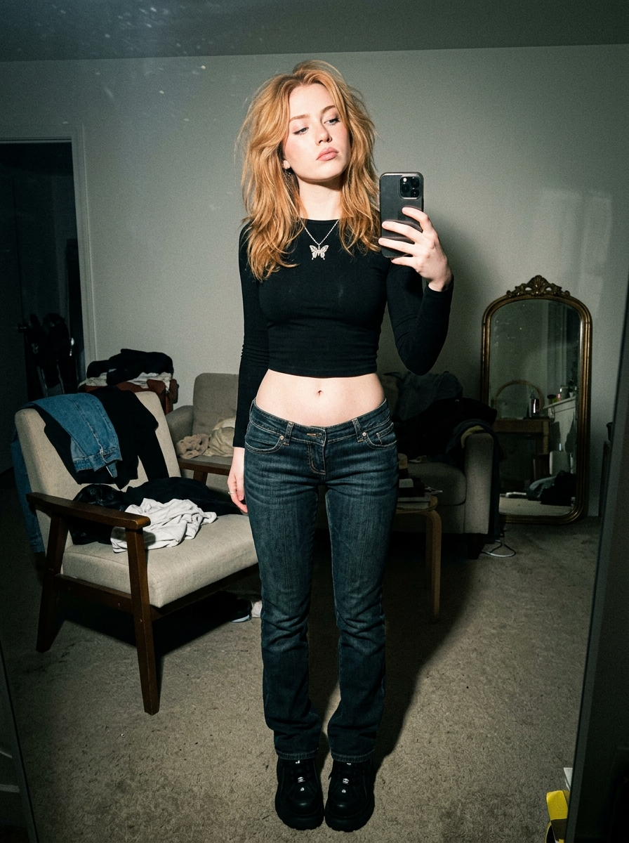 {"prompt_data":{"subject_breakdown":{"demographics":"young model, roughly 20 years old, Gen Z aesthetic","hair":"Voluminous, layered strawberry blonde\/hair, '90s blowout style with curtain bangs framing the face, messy but styled texture","face":"Oval face shape, prominent cheekbones, blue-grey eyes looking directly at lens, full lips with rose-pink gloss, light natural makeup, defined lashes ","expression":"Confident, slightly haughty 'baddie' gaze, chin tilted upwards, relaxed but posing"},"apparel_and_accessories":{"clothing":"Black, long-sleeved tight-fitting crop top or bodysuit , minimal texture","jewelry":"Delicate silver chain necklace with a small crystal butterfly pendant","styling":"Casual glam, Y2K revival influence, clean model aesthetic mixed with night-out vibes"},"pose_and_framing":{"type":"Selfie shot (POV)","angle":"Slightly low angle looking up at the subject or straight-on with chin raised","composition":"Close-up portrait, arm visible in foreground (holding camera\/phone), subject off-center slightly","focus":"Sharp focus on the face and eyes, slight motion blur on the foreground arm"},"environment_and_lighting":{"setting":"Indistinct indoor interior, likely a bedroom or hallway, dark muted background","lighting_source":"Hard direct camera flash (on-camera flash)","lighting_quality":"High contrast, harsh shadows cast directly behind the subject against the wall, specular highlights on the forehead, nose, and lips, 'red-eye' reduction style flash","mood":"Candid, edgy, late-night, flash photography aesthetic, personal social media snapshot"},"camera_and_technical":{"camera_woman":"Simulated iPhone 15 Pro or vintage digital camera (e.g., Canon IXUS \/ Sony Cyber-shot)","lens_specs":"24mm wide-angle lens (smartphone equivalent)","aperture":"f\/1.8","shutter_speed":"1\/60s","iso":"ISO 400","aesthetic_style":"Flash photography, digital noise\/grain texture, authentic amateur photography feel, raw color grading"},"quality_modifiers":{"details":"Ultra photorealistic, hyper-detailed skin texture (pores, minor blemishes visible), realistic hair strands, 8k resolution, raw photo, unedited look, masterclass photography"}}}