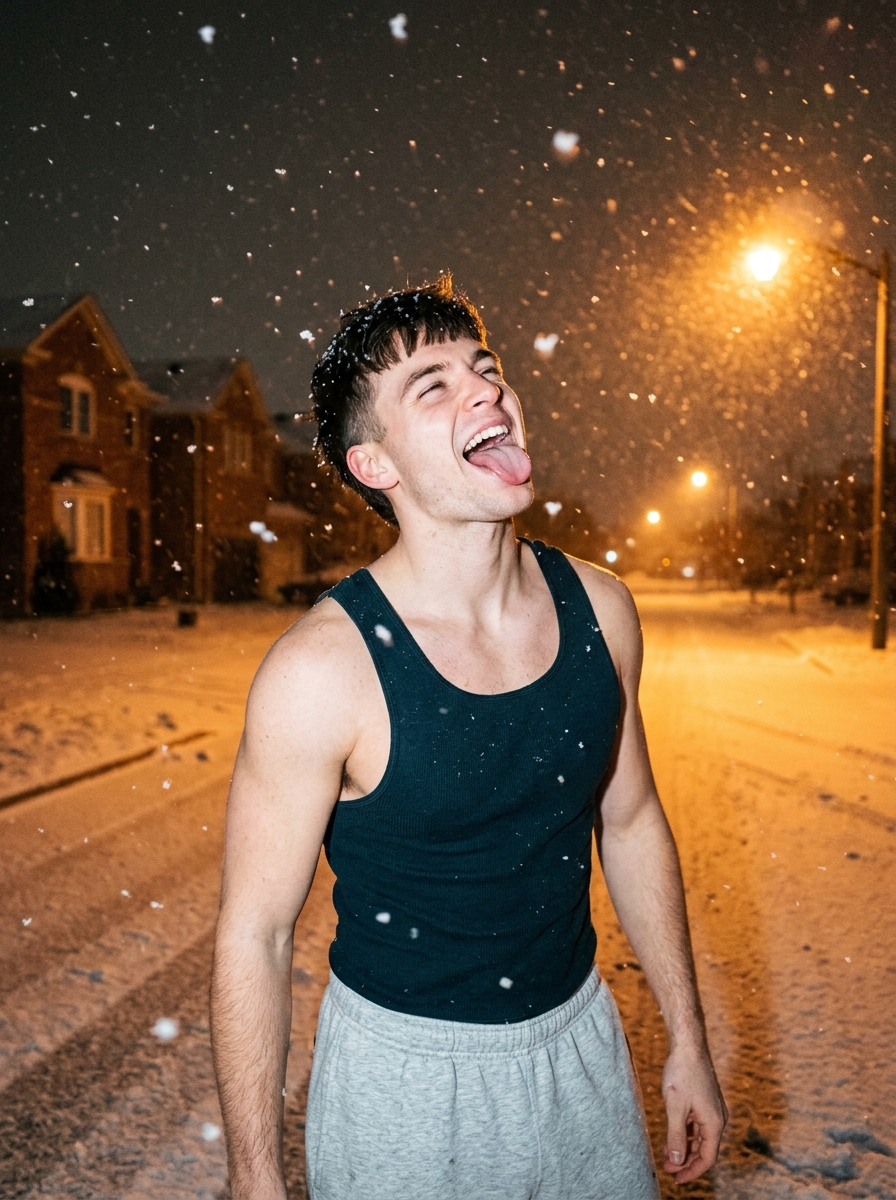 {"prompt_data":{"subject_details":{"appearance":"young athletic male model with short dark brown hair, textured cut with straight fringe, hair slightly messy with snowflakes clinging to strands.","expression_and_pose":"Playful and candid pose, head tilted back looking up towards the sky, eyes closed or squinting in enjoyment, mouth open with sticking out to catch falling snowflakes.","clothing":{"upper_body":"fitted tank top with broad shoulder straps, relaxed scoop neckline, ribbed texture fabric.","lower_body":"Light heather grey sweatpants or joggers with a elastic waistband, casual loungewear fit."}},"environment_context":{"setting":"Suburban residential street at night during a heavy snowstorm.","background_elements":"brick houses in the distance, snow-covered road and sidewalks, streetlights emitting a warm yellow\/orange glow.","weather":"Heavy snowfall, large snowflakes falling against the dark sky and illuminated by lights."},"lighting_and_atmosphere":{"lighting_setup":"Mixed lighting scenario; strong warm yellow backlighting from overhead street lamps creating a halo effect on the snow, combined with a direct, cool-toned camera flash illuminating the subject's face and upper body.","mood":"Spontaneous, joyful, wintery, nostalgic, cold but energetic, candid moment.","color_palette":"High contrast between the deep blacks of the hair\/top, the bright snow, and the warm amber hues of the streetlights."},"camera_specifications":{"camera_man":"Sony A7R V or Fujifilm X100V (simulating a high-end flash photography aesthetic).","lens":"35mm prime lens.","shutter_speed":"1\/125s (to freeze the falling snowflakes slightly while capturing motion).","iso":"800 (grainy film texture).","technical_details":"Direct on-camera flash style, 8k resolution, raw photo quality."},"style_modifiers":["Ultra Photorealistic","Candid Photography","Flash Photography","Street Style","Winter Aesthetic","Highly Detailed Texture","Cinematic Lighting"]}}