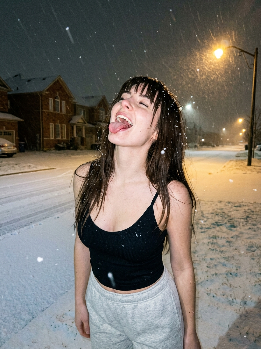 {"prompt_data":{"subject_details":{"appearance":"young model with, long dark brown to hair with straight bangs, hair slightly messy with snowflakes clinging to strands.","expression_and_pose":"Playful and candid pose, head tilted back looking up towards the sky, eyes closed or squinting in enjoyment, mouth open with sticking out to catch falling snowflakes.","clothing":{"upper_body":"fitted tank top with thin spaghetti straps, scooped neckline, ribbed texture fabric.","lower_body":"Light heather grey sweatpants or joggers with a elastic waistband, casual loungewear fit."}},"environment_context":{"setting":"Suburban residential street at night during a heavy snowstorm.","background_elements":"brick houses in the distance, snow-covered road and sidewalks, streetlights emitting a warm yellow\/orange glow.","weather":"Heavy snowfall, large snowflakes falling against the dark sky and illuminated by lights."},"lighting_and_atmosphere":{"lighting_setup":"Mixed lighting scenario; strong warm yellow backlighting from overhead street lamps creating a halo effect on the snow, combined with a direct, cool-toned camera flash illuminating the subject's face and upper body.","mood":"Spontaneous, joyful, wintery, nostalgic, cold but energetic, candid moment.","color_palette":"High contrast between the deep blacks of the hair\/top, the bright snow, and the warm amber hues of the streetlights."},"camera_specifications":{"camera_woman":"Sony A7R V or Fujifilm X100V (simulating a high-end flash photography aesthetic).","lens":"35mm prime lens.","shutter_speed":"1\/125s (to freeze the falling snowflakes slightly while capturing motion).","iso":"800 (grainy film texture).","technical_details":"Direct on-camera flash style, 8k resolution, raw photo quality."},"style_modifiers":["Ultra Photorealistic","Candid Photography","Flash Photography","Street Style","Winter Aesthetic","Highly Detailed Texture","Cinematic Lighting"]}}