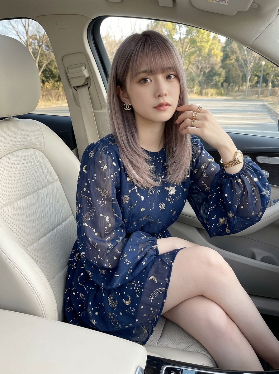 {"prompt_data":{"subject":{"demographics":"young model of Southeast, fair to ","hair":{"color":"Ashy light brown\/mauve with subtle pink undertones (Balayage or Ombre style)","style":"Long, loose waves, straight-cut fringe\/bangs softly framing the forehead","texture":"Thick, soft, and voluminous","length":"Past shoulders"},"face":{"features":"Large, light-colored eyes (possible contacts), defined nose and jawline, soft skin texture","makeup":"Subtle cut-crease eye makeup, long lashes (mascara \/falsies), neutral light pink\/peach glossy lipstick , soft pink blush emphasizing the cheeks","expression":"Calm, neutral, serious\/pouty direct gaze at the camera"}},"clothing":{"type":" ier top\/dress with sheer sleeves","material":"Navy blue sheer mesh or tulle over an opaque lining ( ier section)","color_palette":["Navy Blue","Gold","Silver","White\/Cream"],"design_details":{"base":"Navy blue sheer fabric","pattern":"Elaborate embroidered or foiled pattern featuring celestial elements (stars, comets) and mythological creatures (e.g., Pegasus, unicorn) in shimmering gold and silver accents.","fit":"Form-fitting ier bodice with structured boning; voluminous sheer sleeves with tapered cuffs"}},"accessories":{"jewelry":["Gold and white\/cream enamel or pearl-accented ear cuff\/clip with a recognizable interlocking logo (e.g., Chanel style) on the right ear","Multiple gold rings on the right hand (including knuckle rings)","Large gold watch or cuff bracelet on the left wrist (partially )"],"nails":"Long, coffin-shaped white\/cream acrylic or gel nails"},"pose_and_framing":{"shot_type":"Close-up\/Medium Close-up (chest up)","stance":"Sitting in the passenger seat of a car, body angled slightly to the right","hands":"Right hand raised and resting elegantly near the chin\/cheek, showcasing the nails and rings; left arm\/hand resting near the side\/watch "},"environment":{"setting":"Interior of a luxury car (likely a Mercedes-Benz based on seat design)","background_elements":["Cream\/Off-leather interior\/upholstery (seats, headrest)","Clean, modern car interior design","Soft-focus, blurred outdoor background through the rear window (trees, road\/highway structure)"],"lighting":"Bright, soft, natural light coming from the side\/front (possibly the car window), creating a gentle glow on the skin and highlighting the shimmering details.","depth_of_field":"Shallow depth of field (bokeh background)"},"aesthetic_style":{"vibe":"Luxury, high fashion, celestial theme, car selfie\/portrait, glamorous","visual_quality":"High resolution, sharp focus on the subject, photorealistic, attention to texture detail (sheer fabric, embroidery, leather)"}}}