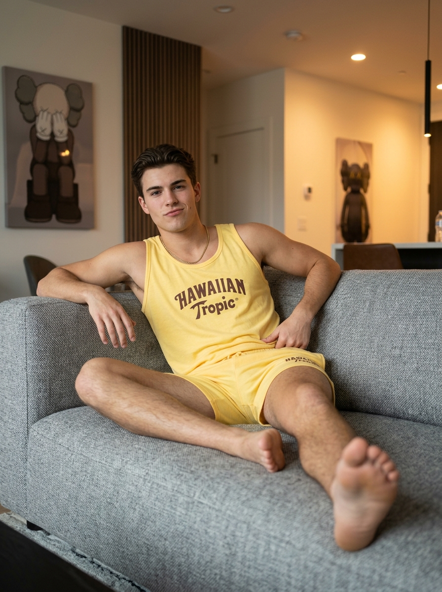 {"prompt_data":{"subject":{"description":"Young model in his 20s with a Y2K-inspired cool, playful, confident handsome look.","features":"clean groomed skin with light stubble, cool undertone, sharp jawline with a refined V-shape face, high-visual-impact handsome features.","expression":{"eyes":{"look":"large sharp eyes, confident gaze directed toward the camera","energy":"cool, playful, slightly teasing","details":"K-pop idol style natural features, emphasized aegyosal"},"mouth":{"position":"relaxed lips with a subtle smirk","energy":"effortlessly cool"},"overall":"high-impact yet relaxed Y2K-influenced masculine expression"},"hair":{"style":"short sleek textured hair with neatly trimmed bangs","effect":"glossy, clean, fashion-forward finish"},"accessories":"Gold chain necklace, small studs or none, small minimalist tattoo on the left inner forearm."},"clothing":{"outfit":"Matching yellow two-piece loungewear set.","top":"Yellow fitted tank featuring the text 'HAWAIIAN TROPIC' in brown serif font with a hibiscus flower and palm graphic on the side.","bottoms":"Matching yellow shorts at the waist and area."},"pose_and_action":{"posture":"Reclining and lounging comfortably on a grey textured sofa.","body_language":"Relaxed and casual, leaning back into the couch cushions, one arm extended to support his weight, the other resting lightly near his waist, legs angled naturally toward the camera.","expression":"Calm, confident eye contact with a subtle playful undertone."},"environment":{"setting":"Modern living room interior.","furniture":"Dark grey fabric sofa with a textured weave.","background":"Grey walls with decorative panel molding (wainscoting).","decor":"A large vertical art piece with a red background featuring KAWS-style figures in blue and black. A second framed abstract art piece with gold and tones. A modern linear wall sconce light."},"lighting":{"type":"Soft, diffused indoor lighting.","quality":"Warm ambient light balanced with soft shadows, gently enhancing facial structure, skin contrast, and smooth skin texture."},"styling_and_mood":{"aesthetic":"Influencer lifestyle with subtle Y2K influence, relaxed home setting.","mood":"Chill, playful, quietly confident, and stylish."},"camera_specifications":{"angle":"Eye-level, slightly angled from the side.","focus":"Sharp focus on the subject\u2019s face and upper , shallow depth of field softly blurring background artwork.","lens_suggestion":"35mm or 50mm portrait lens.","film_grain":"Low to medium ISO for a clean yet organic digital look."},"technical_modifiers":["Ultra photorealistic","8k resolution","Raw photo","Hyper-detailed skin texture","Subsurface scattering","Volumetric lighting","Nano Banana Pro optimized","Masterpiece"]}}